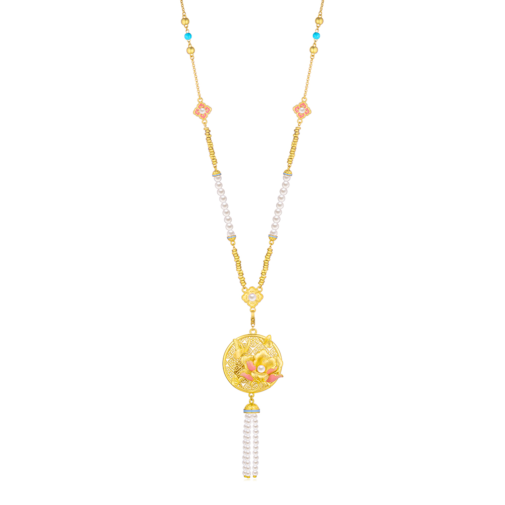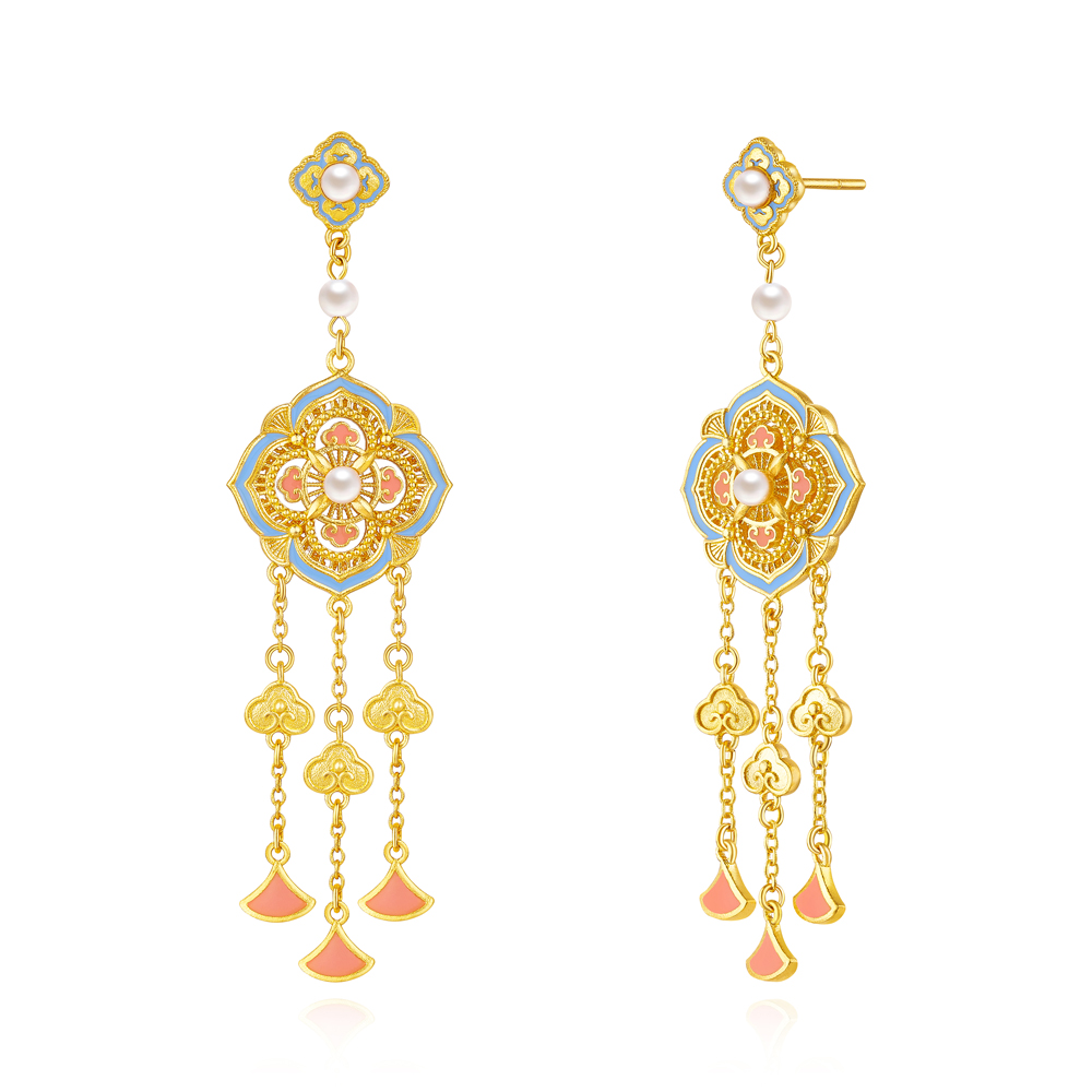 “庭前木芙蓉,姿色敻殊異”,芙蓉清雅,引蝶流連。將蝴蝶環繞芙蓉的畫面,融入花絲編織的四合如意網底,再現宋朝花事盛景,暗喻福運迭至。綠松石、珍珠流蘇與柔粉色鎏彩相互映襯,詩意翩躚,美不勝哉。