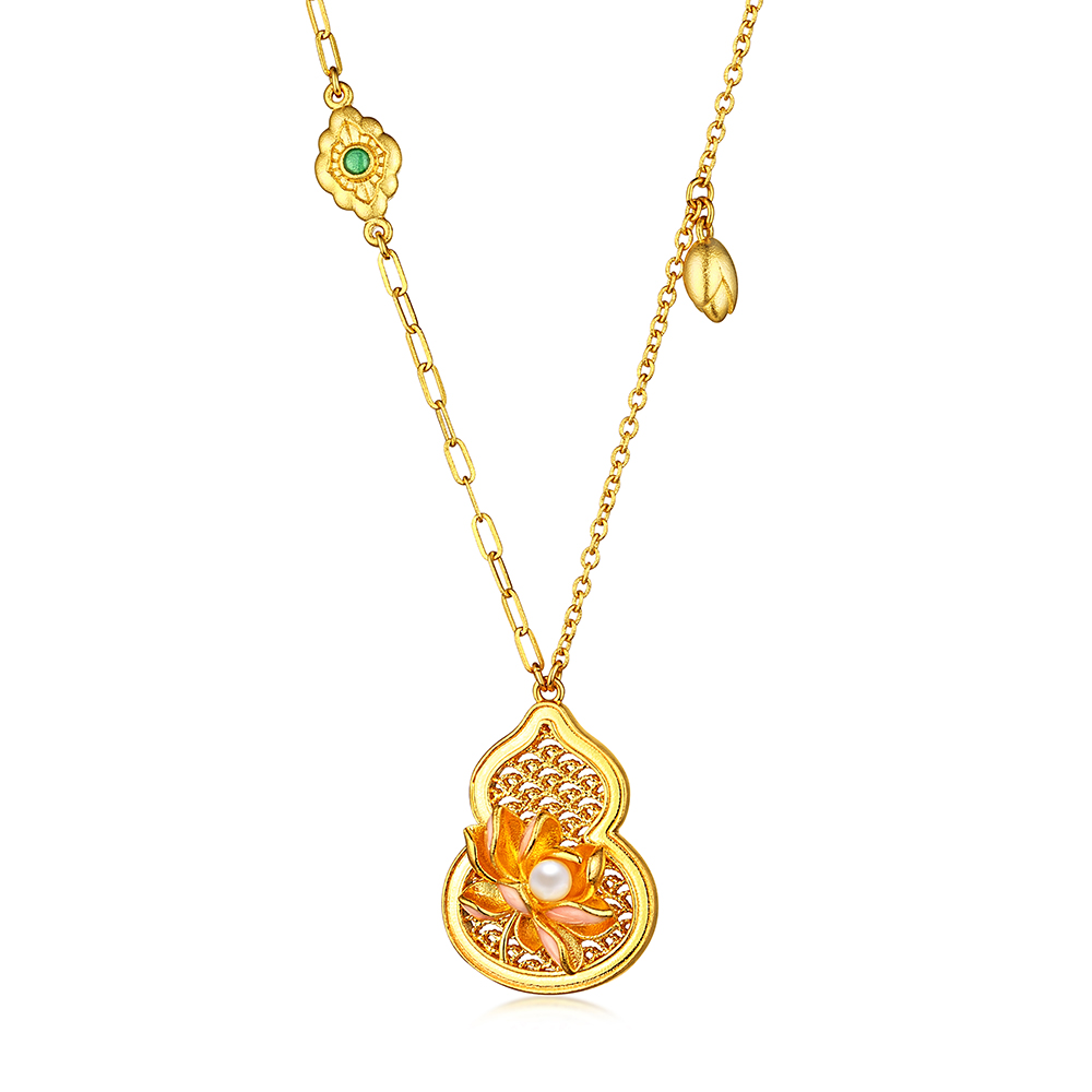 芙蓉歸深處,浮舟夢芳華。非物質文化遺產古法花絲工藝編織鏤空水紋背景,水潤萬物,和則共生,含著珍珠的水芙蓉,於葫蘆造型上綻放粉色華彩,呈現出一幅秀美景象。浮生半日,閑來無事賞幽蓮,祈願福祿如意攜夢來。