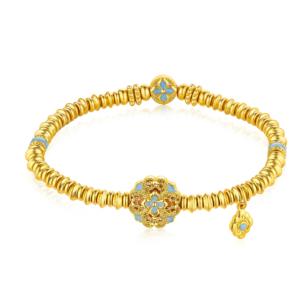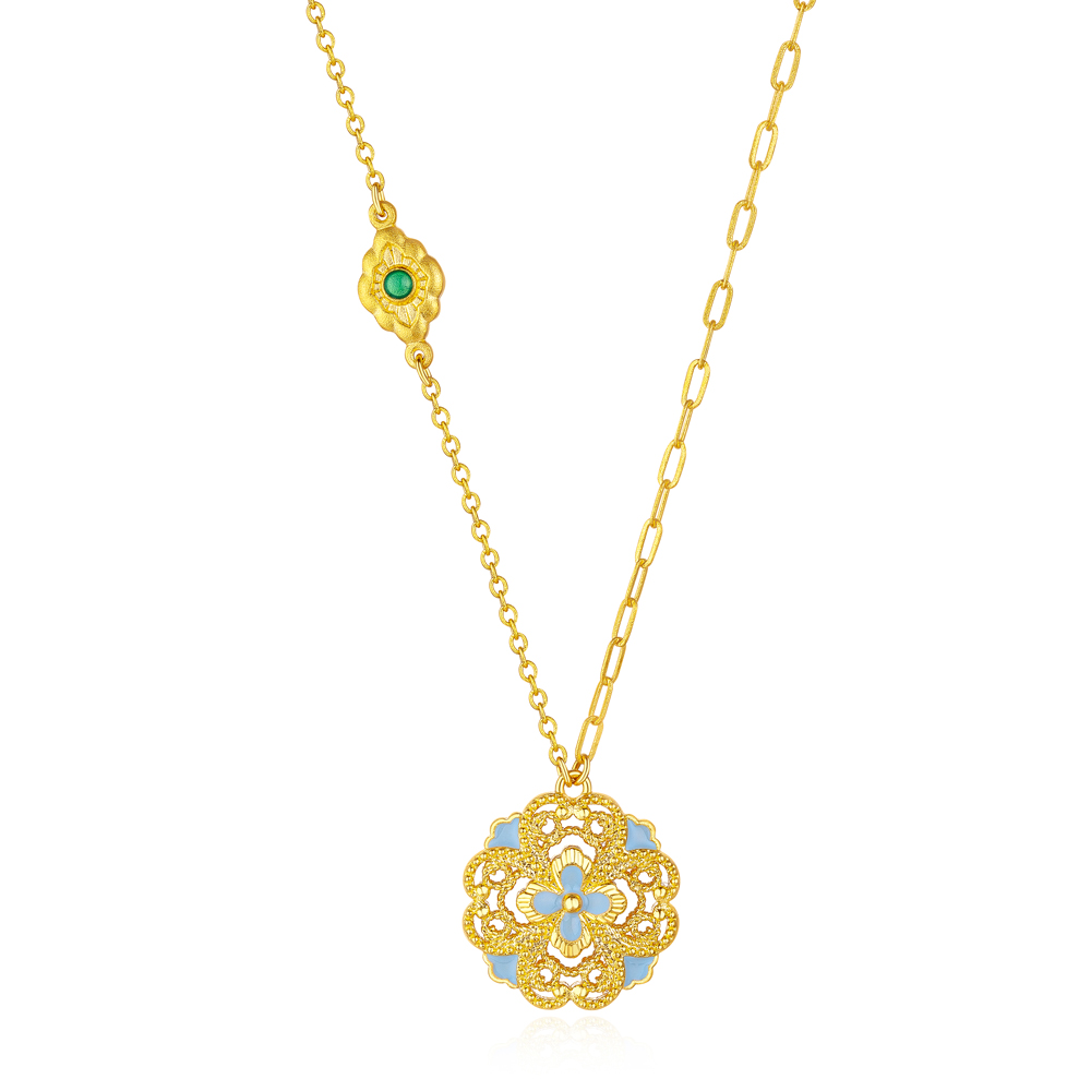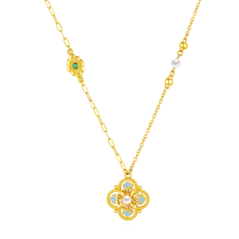 「福滿傳家-宋韻傳家」系列旨在讓藝術融入生活,宋瓷淡雅天青色、宋錦柿蒂紋和團花紋、宋墨丹青下的山水、宋畫的清雅芙蓉,都是設計靈感的來源;又從宋代雅事--賞花、品畫中探尋詩意生活美學,再現宋風雅韻,匠心打造款款雅致美飾,千載流傳。