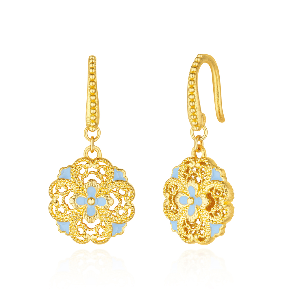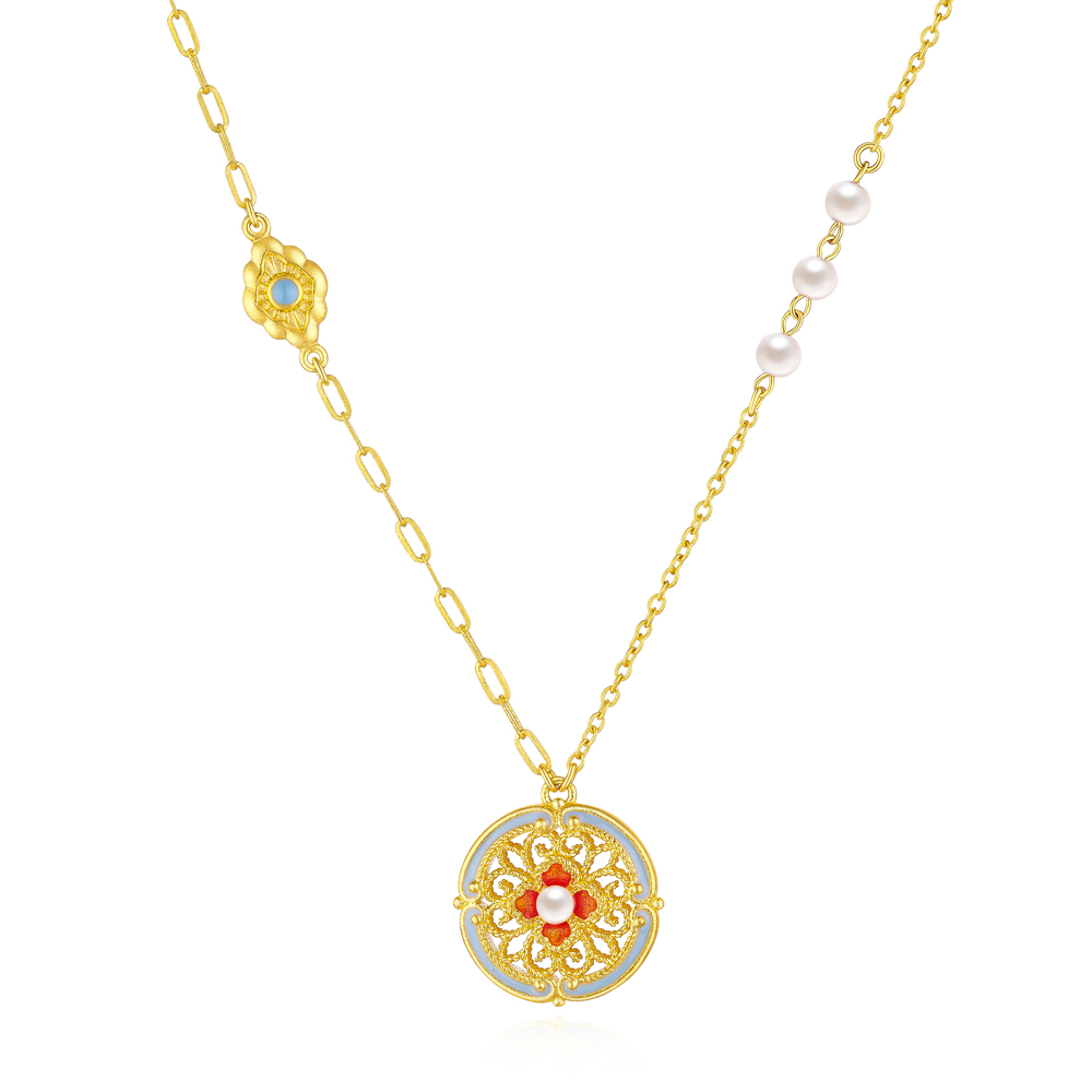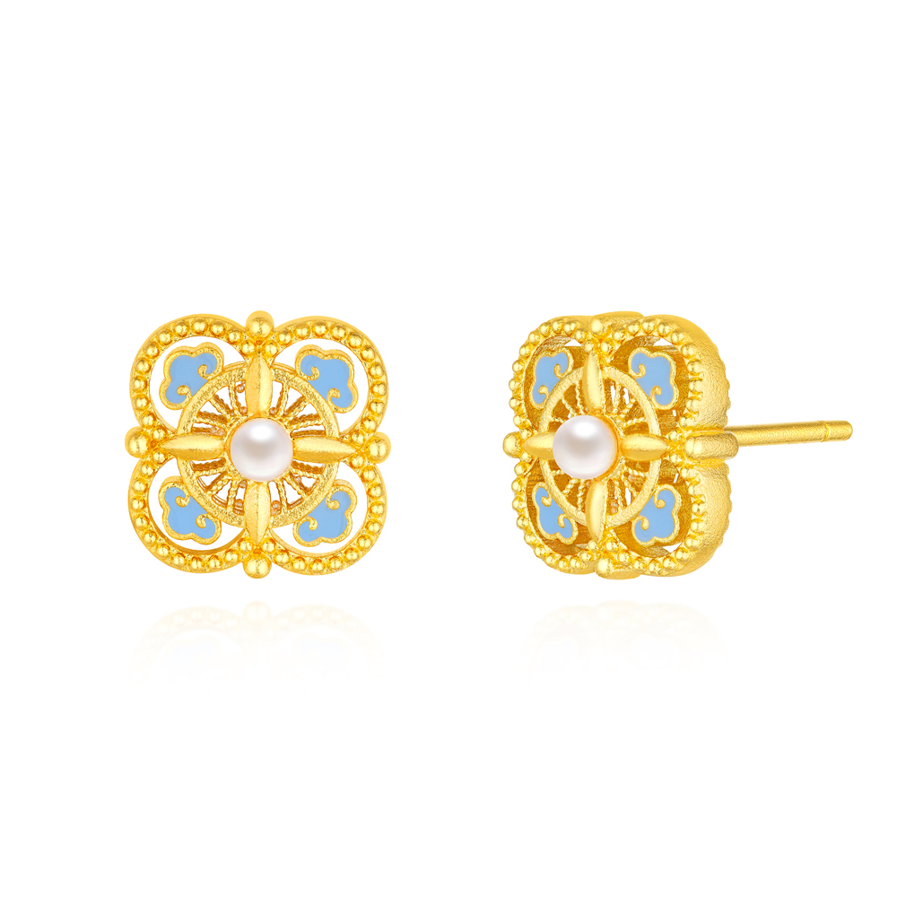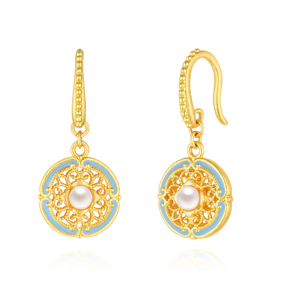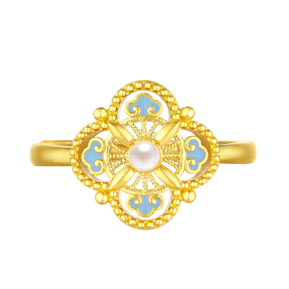 花好月圓,四時吉祥。以宋錦柿蒂紋為靈感,非物質文化遺產古法花絲工藝織就圓弧外型,珍珠點綴,營造一幅月下花開,對影成詩的怡然美景。天青色與溫潤珍珠相得益彰,婉約雅致流於細節,續寫宋式美學清秀雋永,讓藝術融入生活點滴。