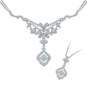 一襲白紗,此生相許,是難以忘懷的璀璨時光。優雅靈動的曼妙曲線勾勒出夢幻唯美的蕾絲造型,鑲滿燦若星河的純澈天然鑽石,宛如新娘華麗純潔的嫁衣,隨著輕盈的步伐而擺動,翩姿麗影,搖曳生輝,盡釋迷人的懾人魅力。放閃車花工藝的融入,使鑽飾愈發閃亮,映爍浪漫甜蜜的羈絆。鑽石項鏈備有同款設計的鑽石吊墜或珍珠鑲鑽吊墜可搭,也可獨立佩戴,滿足新娘多變搭配,時刻綻放熠熠華彩。