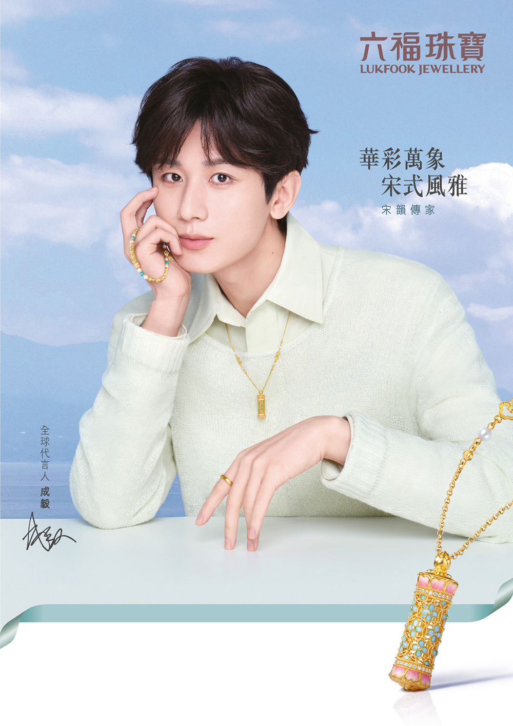 六福珠寶以弘揚中華文化為使命,深研宋代的生活意趣與藝術美學,推出「福滿傳家–宋韻傳家」系列,以宋代美學為靈感源泉,憑藉對傳統紋樣、形制與工藝的匠心塑造,成功將宋風雅韻融入現代設計,自推出後備受市場青睞。為繼續弘揚國風文化,六福珠寶發佈全新系列首飾,以宋錦紋樣、宋畫錦花,宋韻蝴蝶為主要創作元素,搭配鑽石、珍珠、綠松石等寶石,運用古醇金工藝結合花絲、鎏彩、鑲嵌等工藝,以當代視角呈現款款雅致的宋韻美飾,既承襲千年風雅之韻,更以國際化視角詮釋東方美學的生命力。全球品牌代言人、實力演員成毅以溫文爾雅的氣質詮釋宋風雅韻,憑藉在螢幕中塑造的古典形象與謙謙君子的氣質,成毅與「宋韻傳家」系列的文化內核高度契合,舉手投足間盡顯東方文人的儒雅俊秀風範,與六福珠寶共啟文化延展新篇章。