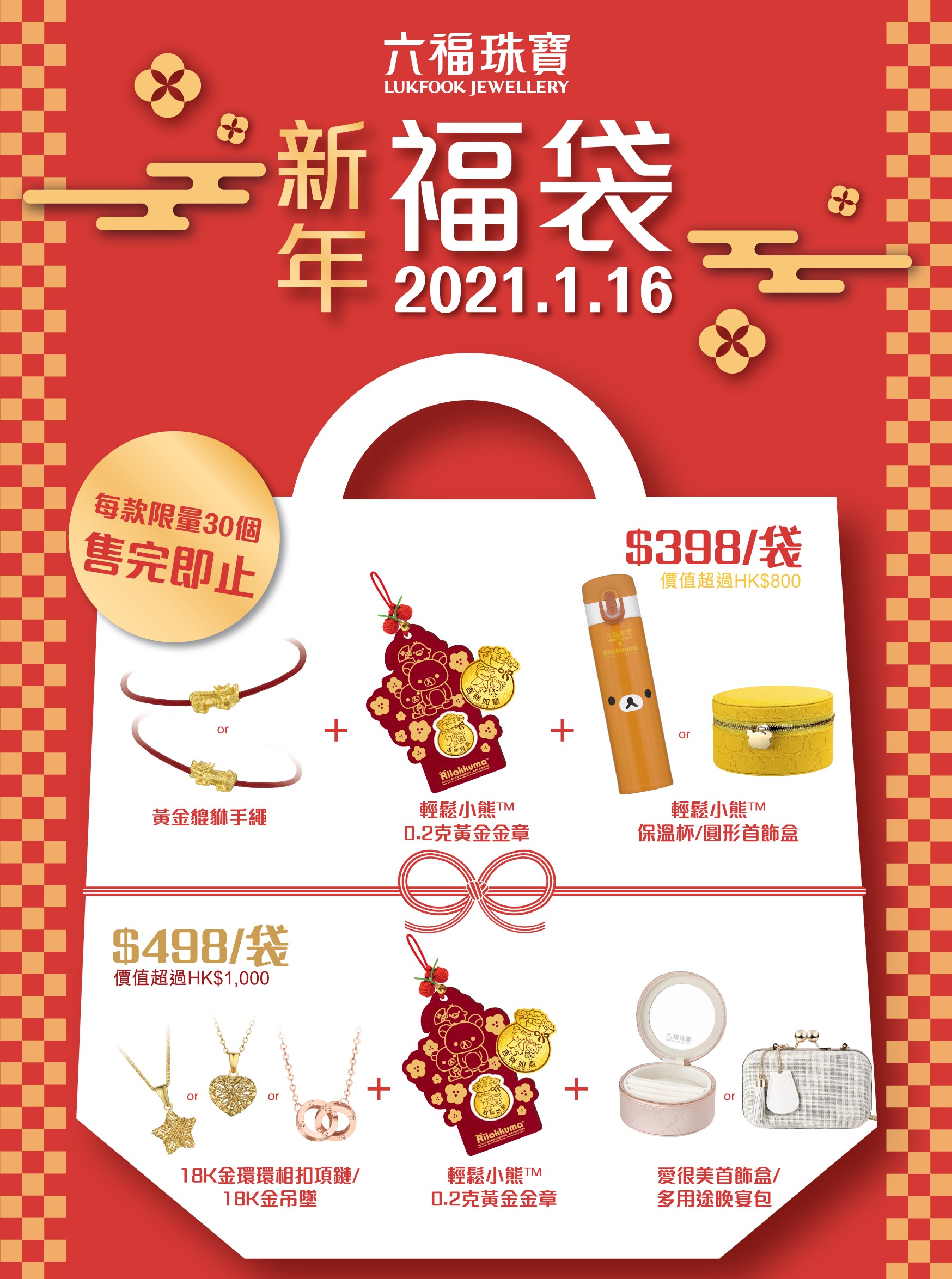 是次活動精心準備了兩款新年福袋供大家選購,內含黃金貔貅手繩、18K金吊墜、輕鬆小熊0.2克黃金金章,輕鬆小熊保溫杯或多用途晚宴包及首飾盒等,總值分別超過HK$800 及HK$1,000,兩款福袋均以總值低於半價發售,並分別定價為HK$398及HK$498,每款限量30個。
