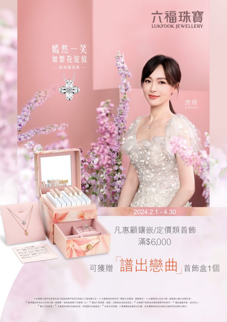 即日起至2024年4月30日,到香港或澳門全線專門店,惠顧指定鑲嵌/定價類首飾滿$6000,可獲贈“譜出戀曲” 首飾盒1個。禮品數量有限,送完即止。