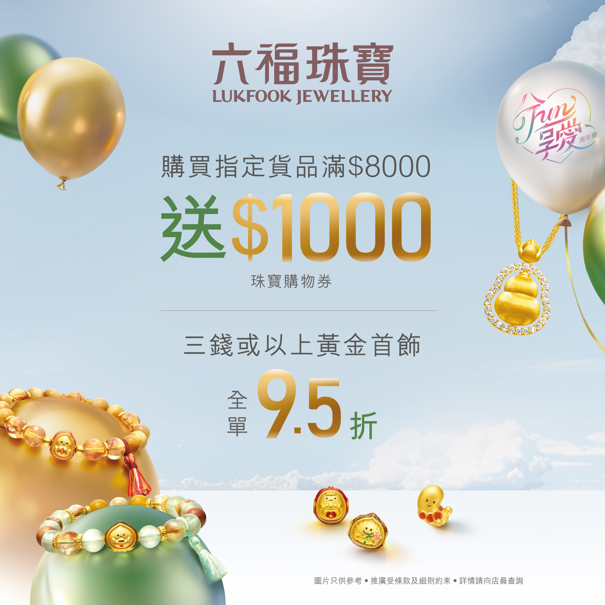 - 由2025年8月15日至2025年10月9日,顧客凡於香港特別行政區或澳門特別行政區之六福珠寶分店惠顧任何珠寶首飾(不包括投資性金粒及金條)並成為六福會員後,可憑有效之銷售單於同一購物分店內即時參加抽獎1次。若該次消費金額滿$20,000,可獲額外一次抽獎機會(即總共2次);達到$20,000後,其後每滿$10,000,可額外獲抽獎機會1次。如此類推,每張銷售單上限10次。
