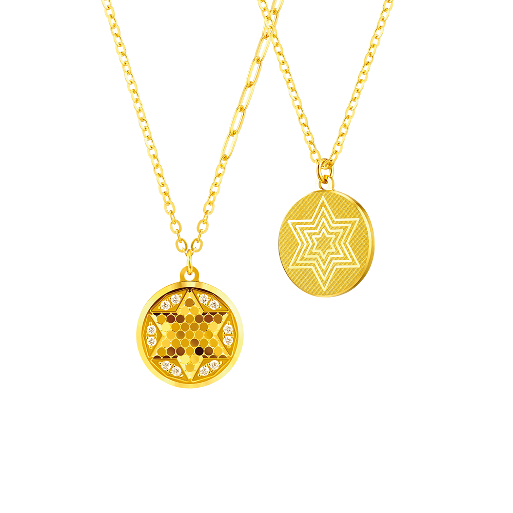 跨越光年的距離,化作你的專屬守護星。設計靈感來自於六角星這一古老而神秘的幾何形狀,將黃金和鑽石的華貴與六角星的神秘相結合,呈現出高貴和典雅的風格。正面六角星在蜂巢效果的加持下,熠熠光芒閃爍,十二顆閃耀的鑽石巧妙分佈在六角星周圍,猶如在十二星宿的守護下,光芒相互輝映,呈現出漫妙的立體感。首飾採用高精度的數控機器鑄製,令鑽石的爪鑲既整齊又統一,精緻不凡。背面勾勒多重六角星圖案,彷佛給予堅定的指引與守護,願你散發獨特的光芒和魅力,同時也是表達矢志不渝情感和默默祝福的方式。