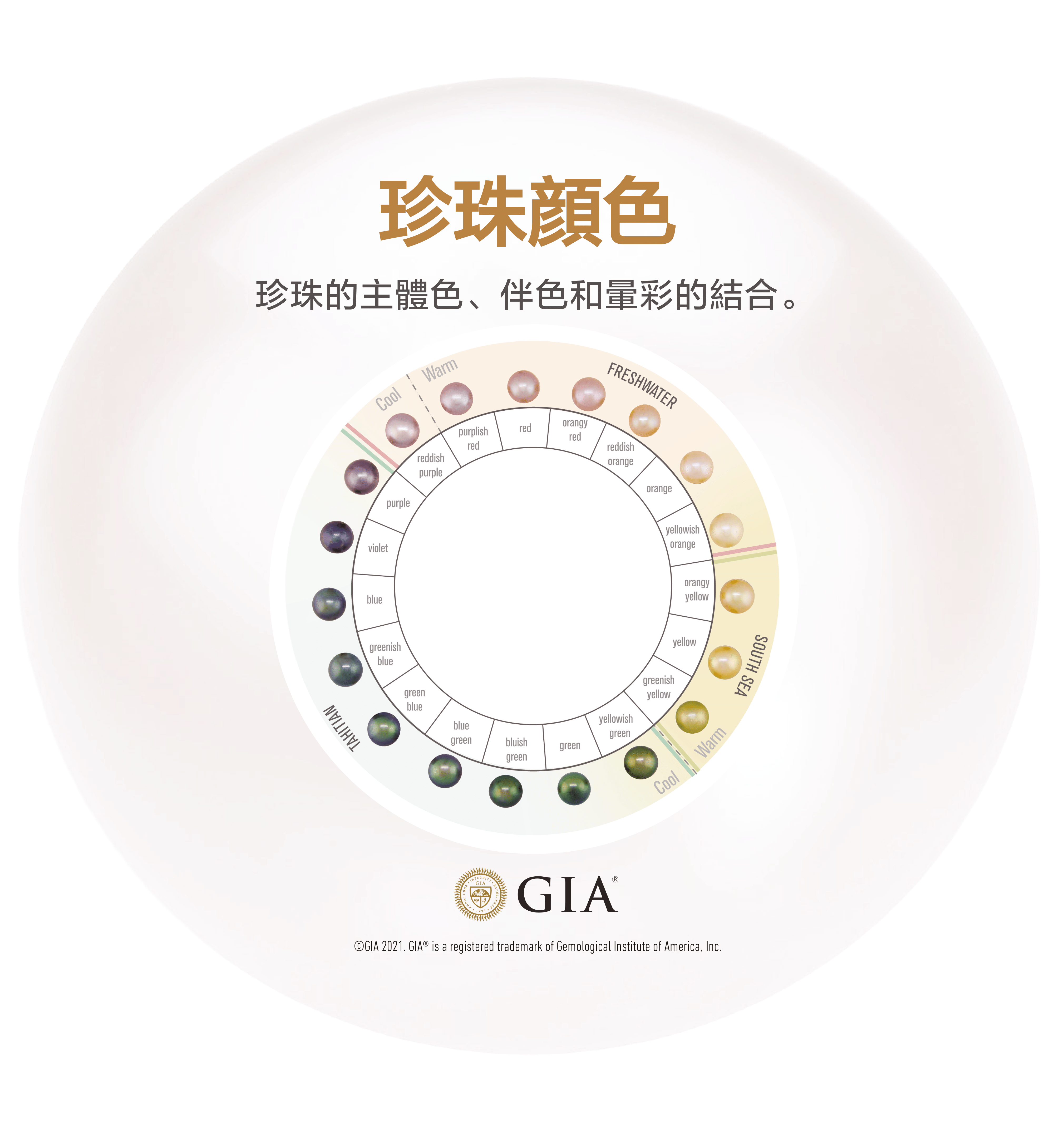 - 顏色(Color): 珍珠的主體色、伴色和暈彩的結合。