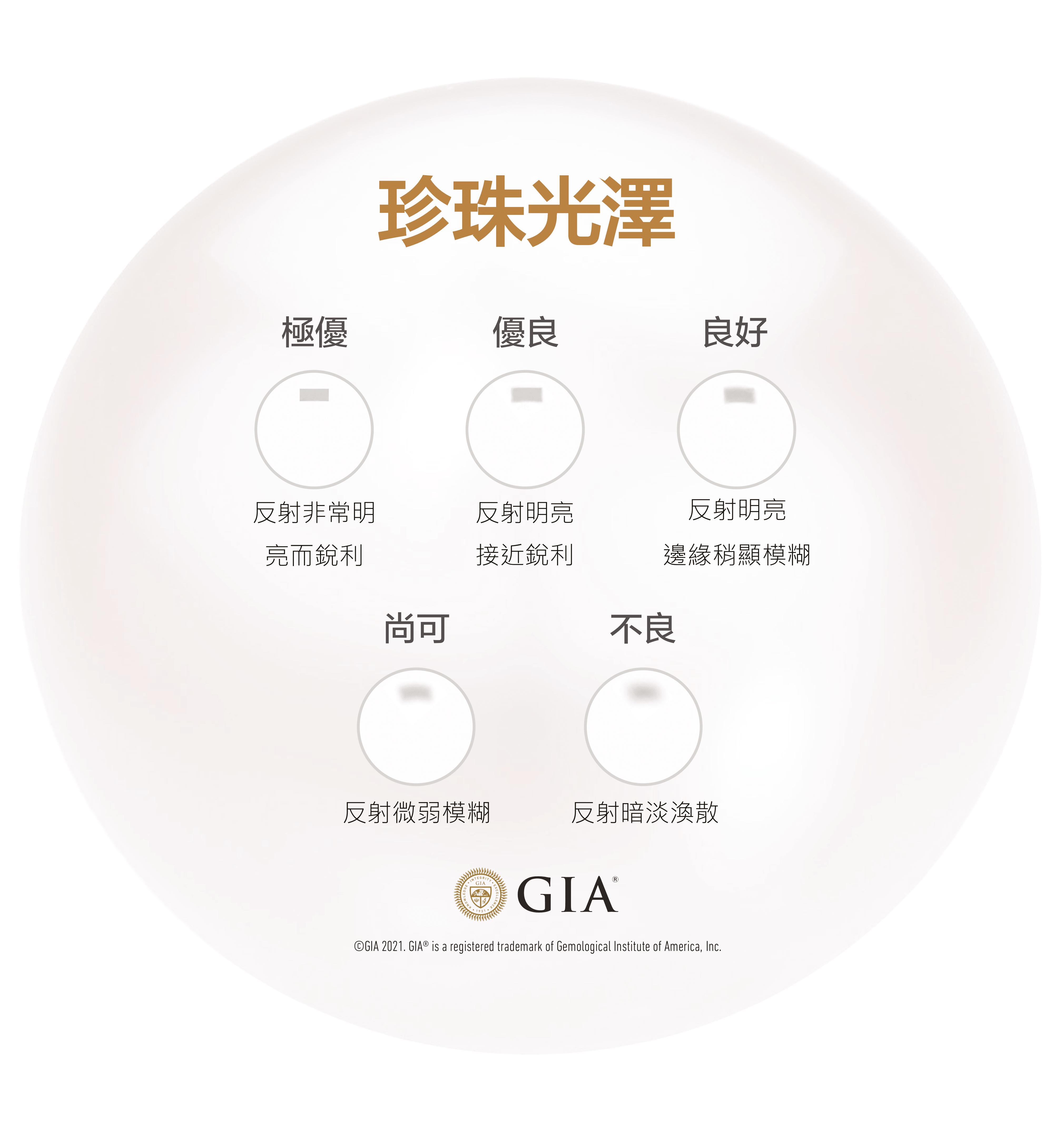 - 光澤(Luster): 珍珠表面或表面附近的反光情況,依據反射的強度和銳利程度來評估。