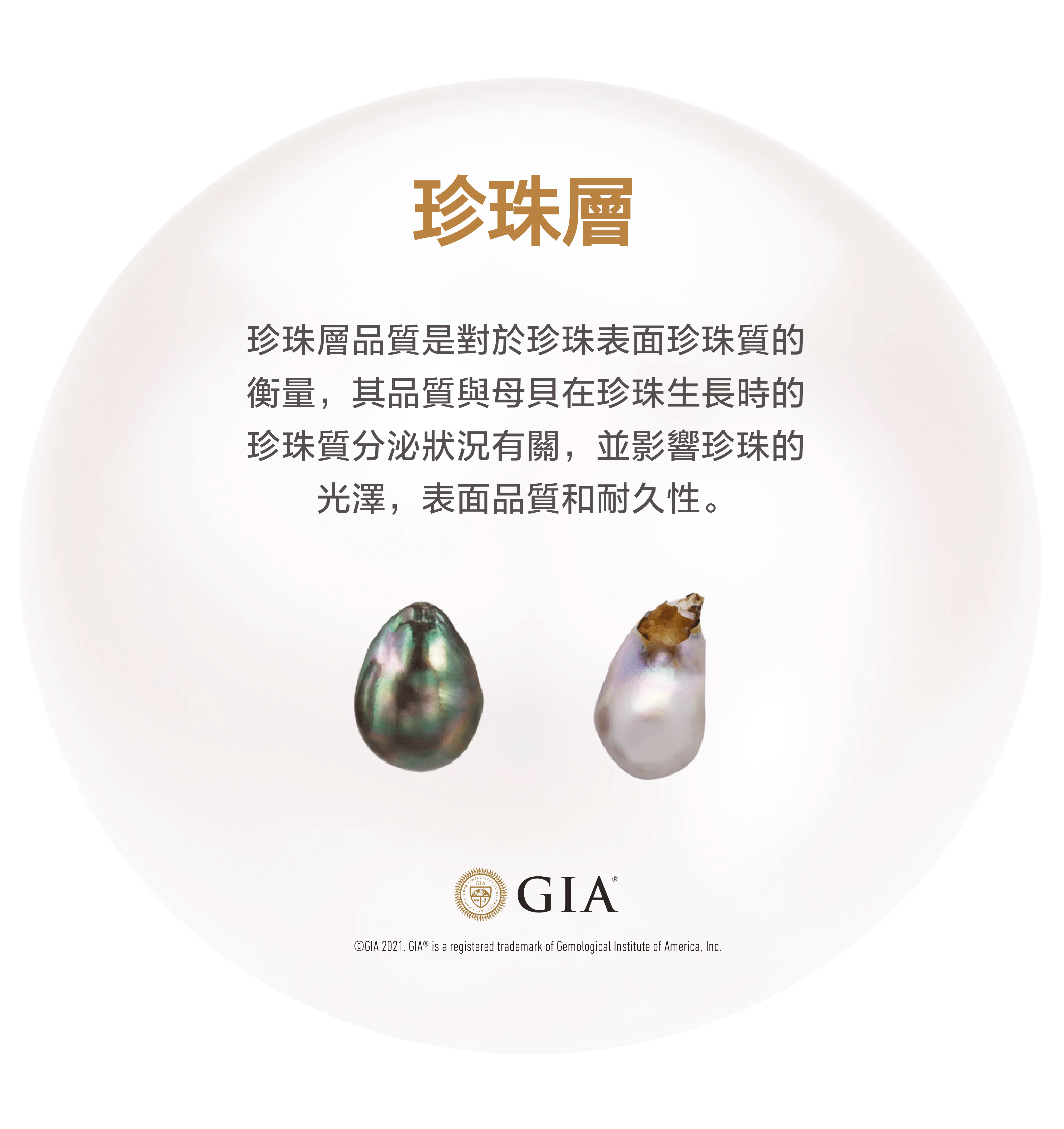 - 珍珠層 (Nacre): 珍珠層品質是對於珍珠表面珍珠質的衡量,其品質與母貝在珍珠生長時的珍珠質分泌狀況有關,並影響珍珠的光澤,表面品質和耐久性。