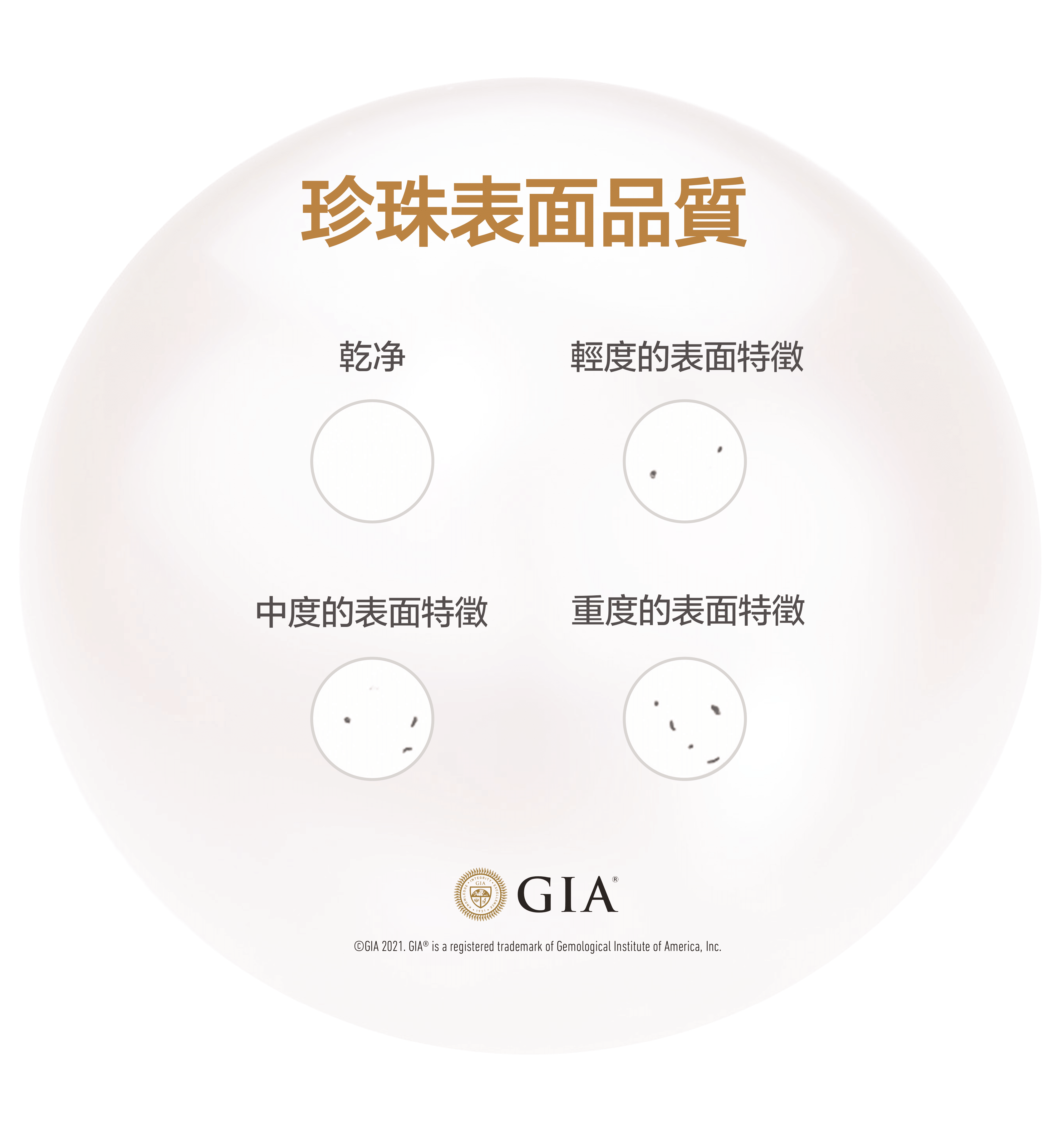 - 表面品質 (Surface Quality): 依據珍珠的表面特徵或不規則進行判定,考慮包括表面特徵的大小、數量、本質、位置、能見度和類型。
