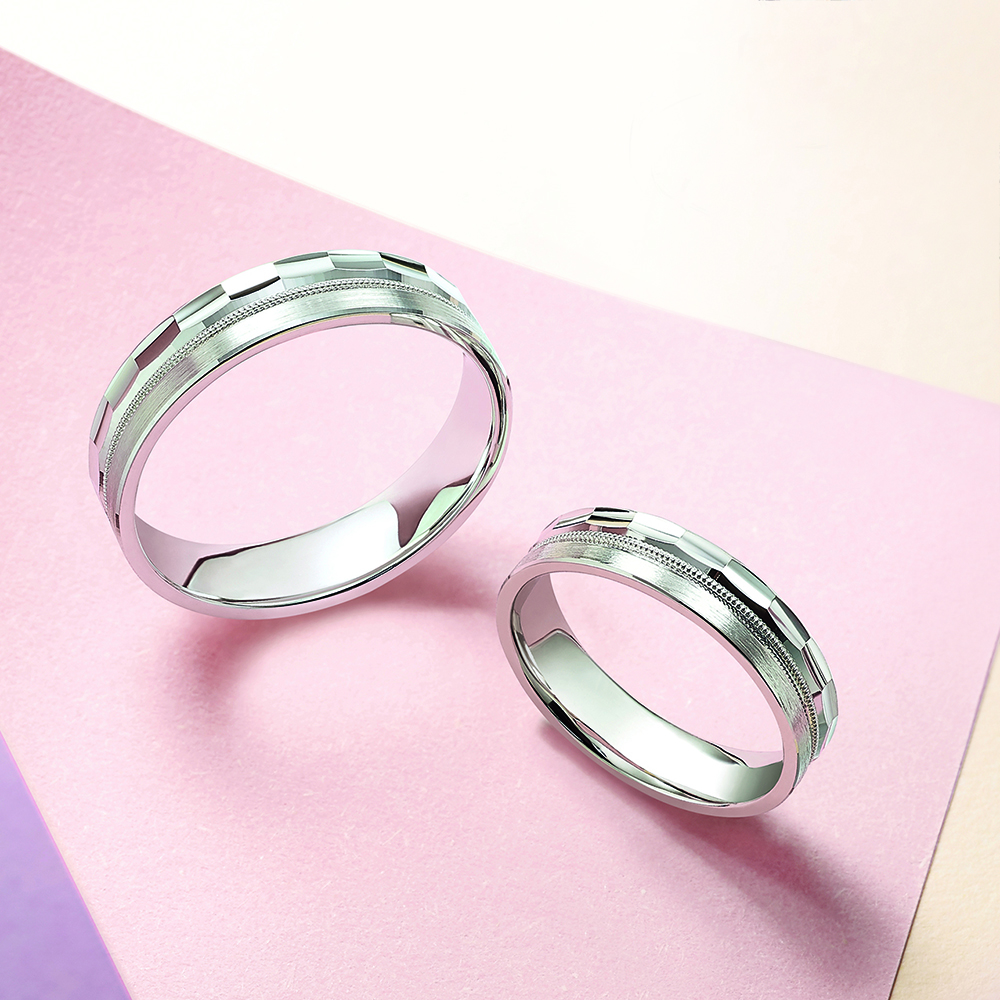 設計師於對戒的鉑金材質上鑄造出一個個獨特有序的方格,每一個方格,就如一幅幅甜蜜的相片,寓意將二人幸福溫馨的一刻定格下來。