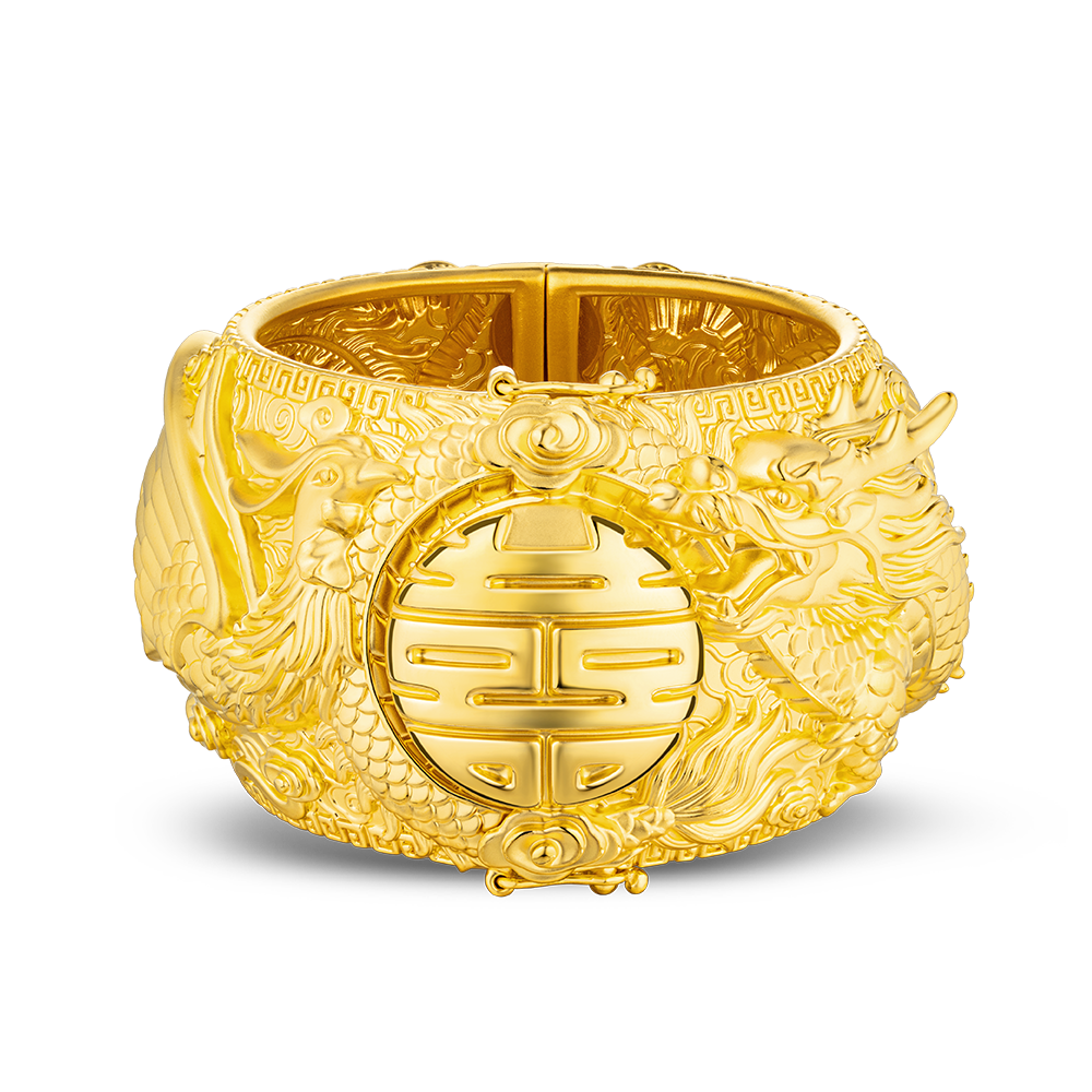 金鐲之上精雕龍鳳圖騰,對望而棲,盤繞寓意幸福甜蜜的「囍」字設計,栩栩如生,盡顯恢弘大氣。龍鳳合囍,富貴繁花,舉手投足間盡顯華貴典雅,帶來攜手與共,白首成約的美好期許。