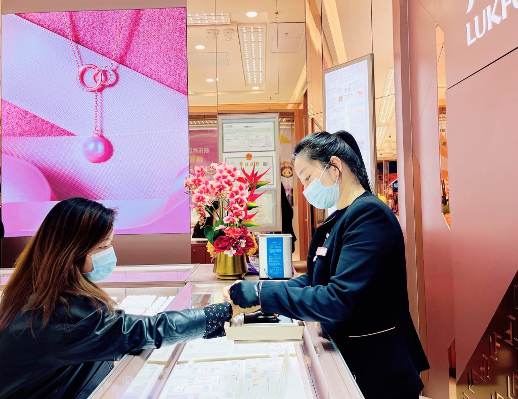 「番禺萬達廣場六福珠寶」位於商場一樓,淡粉色與香檳金色的巧妙融合搭配,營造出    優雅與高貴的購物氛圍。店鋪設計獨具匠心,幾何線條與燈光巧妙運用,簡約中處處流露出質感及六福特色時尚美學,整體空間寬敞明亮,盡顯時尚大氣的風格。店內的珠寶首飾,每一件都經過精雕細琢、工藝精湛,加之款式的琳琅滿目、應有盡有,在燈光的映照下閃爍著熠熠生輝的光芒、璀璨奪目,令進店的顧客紛紛心動購買。此外,店內銷售人員的專業與熱情服務,為顧客提供細緻入微的貼心服務,更是讓顧客感受到歡愉與舒適,完美體現六福珠寶「匠心獨運,服務為本,以客為先」品牌理念。