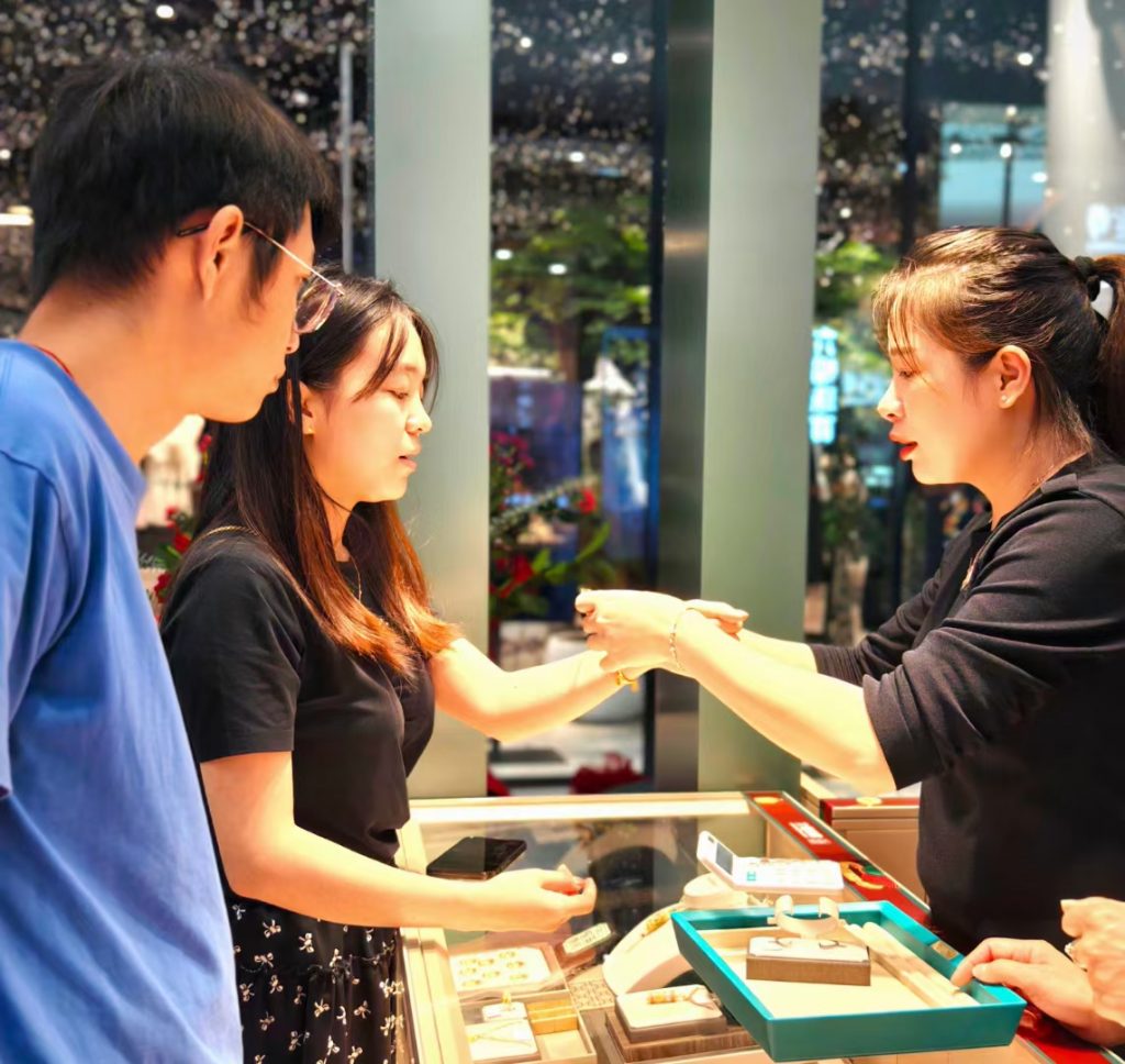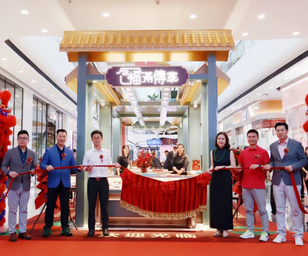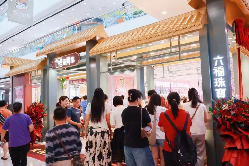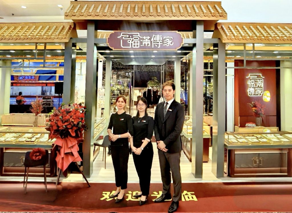 該「福滿傳家」專櫃位於商場一樓,店鋪形象極具東方神韻,古意盎然,完美地展示了中式建築之美。店內主要銷售古法黃金工藝品、古法黃金飾品、古法鑲嵌飾品等各類 產品,為熱愛中國傳統文化、欣賞古法工藝及追求國潮時尚人士提供了更多選擇。