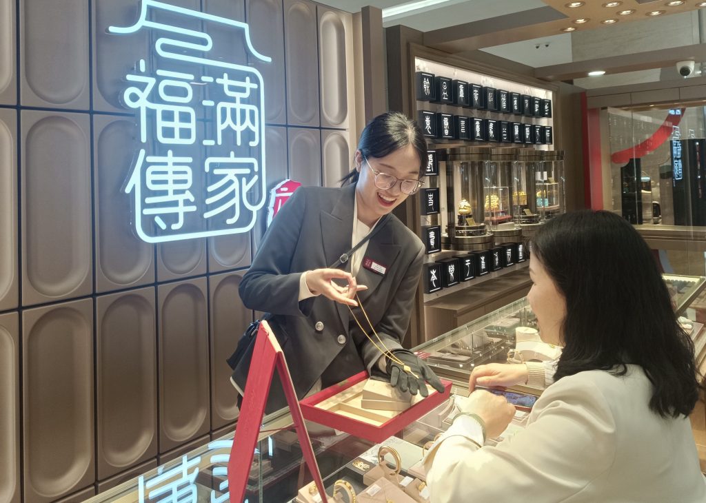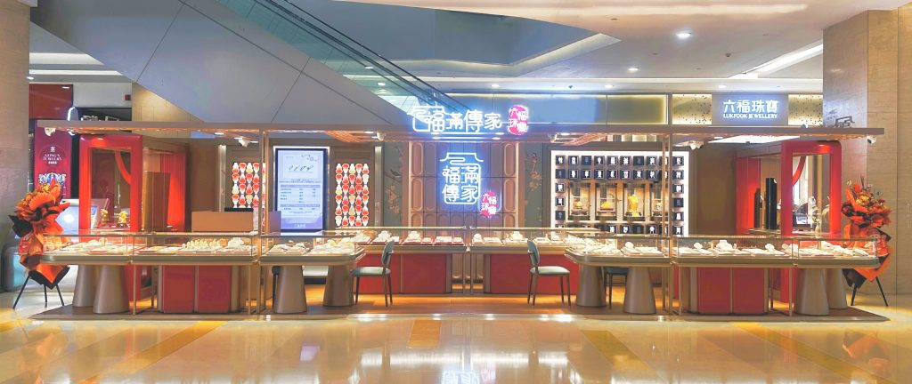 該「福滿傳家」專賣店位於商場負一樓,整體形象盡顯東方神韻,古樸典雅,讓顧客切實感受到中式美學的魅力。店內陳列的各式珠寶首飾,精刻雕琢、古意盎然,古法技藝與傳統文化互相融合,打造出極具文化傳承及收藏價值于一體的黃金飾品,方寸之間,成為家族精神延續的傳世瑰寶。