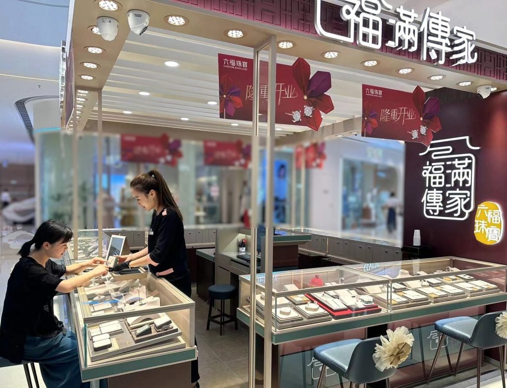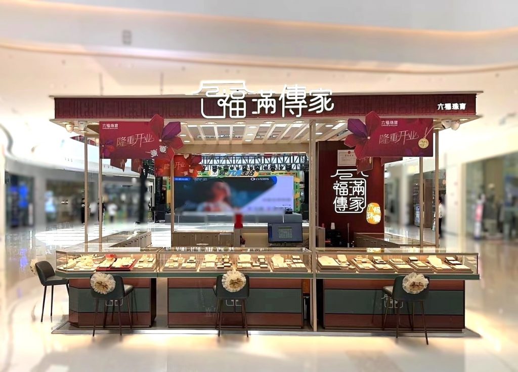 該「福滿傳家」專櫃位於商場一樓,整體形象盡顯東方神韻,古樸典雅,讓顧客切實感受到中式美學的魅力。店內陳列的各式珠寶首飾,精刻雕琢、古意盎然,古法技藝與傳統文化互相融合,打造出極具文化傳承及收藏價值于一體的黃金飾品,方寸之間,成為家族精神延續的傳世瑰寶。