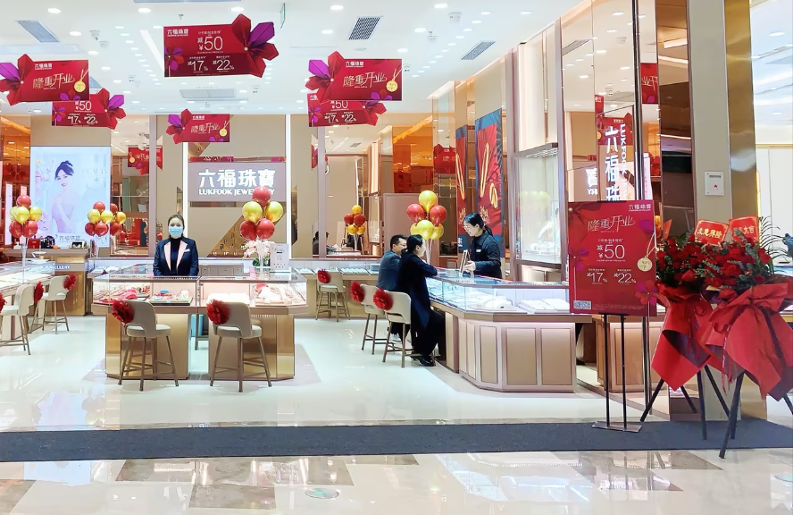 「長沙步步高星城天地六福專櫃」位於購物中心一樓,採用「6 代」裝修風格,低調奢華的香檳金,精心設計的燈光佈局,令店鋪顯得優雅時尚、高檔氣派。開業當天,店內璀璨奪目的珠寶首飾吸引了眾多顧客停留駐足,紛紛進店選購,熱鬧非凡。與此同時,店內銷售人員耐心細緻地作精心推介,並提供試戴服務,給賓客帶來了極為舒適、愉悅的購物體驗,備受好評。