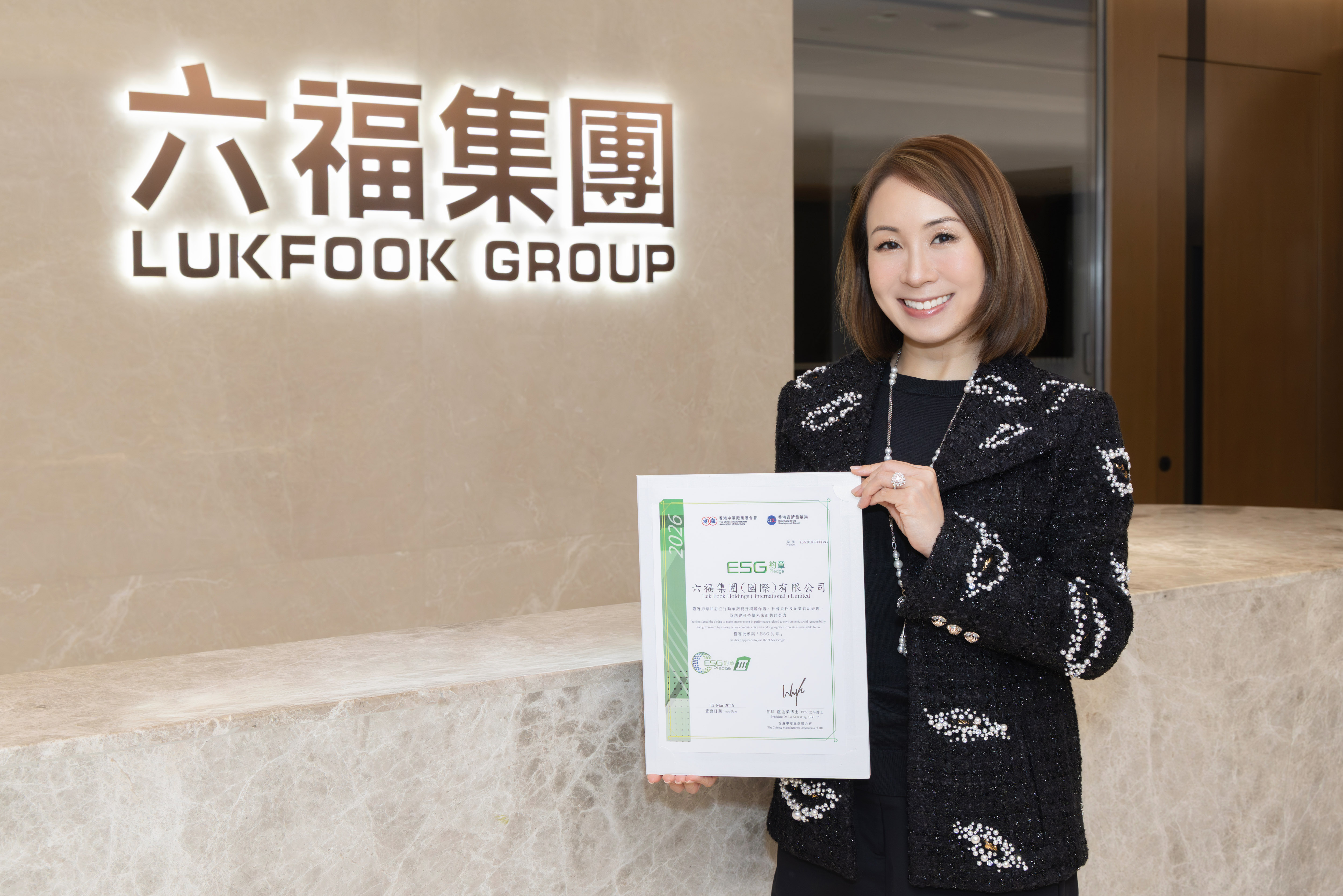 (2026年3月26日)── 六福集團(國際)有限公司(「六福」/「集團」)(股份代號:0590)欣然宣布,憑藉在可持續發展領域的卓越表現,集團連續第四年榮獲香港中華廠商聯合會頒發的「ESG約章」嘉許。此項殊榮不僅肯定了集團在環境、社會及管治(ESG)方面的長期努力,更彰顯了六福在業界作為可持續發展先行者的領導地位。