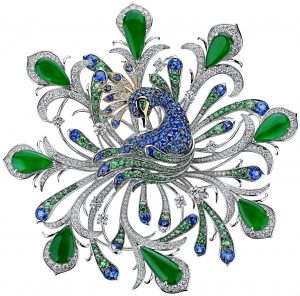 「孔雀圖騰」造型的胸針呈現從孔雀開屏的斑斕羽翼中萃取自然靈感,糅合藍寶石、綠寶石及鑽石的色彩還原了孔雀羽毛的絢麗質感。 |