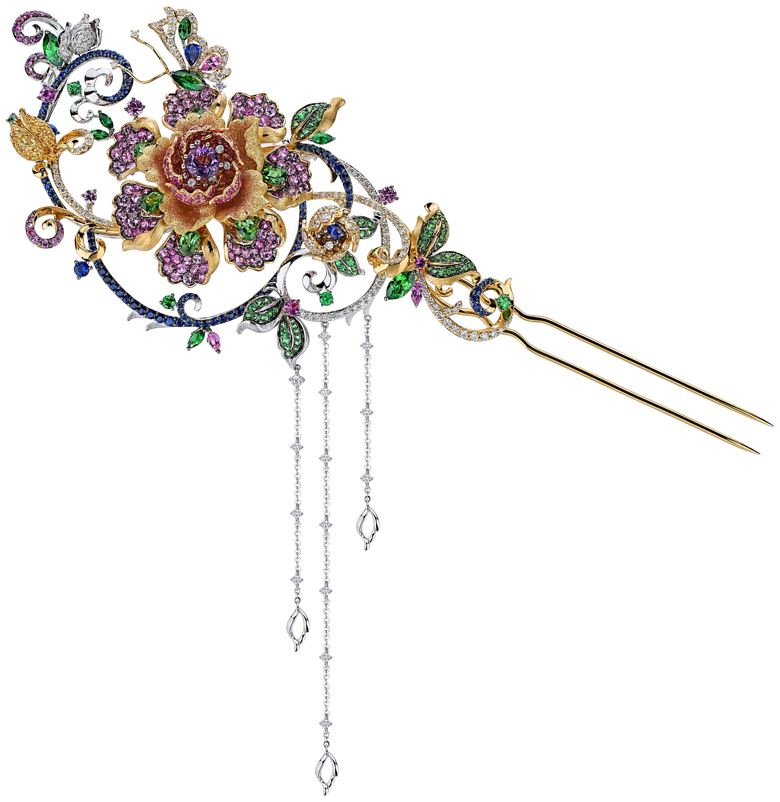 將清代宮廷的琺瑯瓷繪藝術為靈感元素,設計師以珠寶的工藝,展現出帝皇對美的品味以及文化的延續。髮簪主體設計為一朵盛開的牡丹花,運用彩寶石演繹出鮮艷的琺瑯釉色彩和構圖,這款髮簪象微著「萬花獻瑞,盛世昇平」的美好寓意,讓我們體驗那份跨越時空的自然優雅氣韻。 |