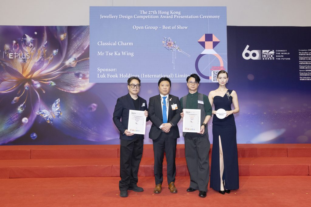 六福集團珠寶設計總監區國文先生(左一)與「公開組大奬」得獎者珠寶設計師陳瀅心女士(右二)接受香港珠寶首飾業商會第一副主席周傑成先生頒發殊榮