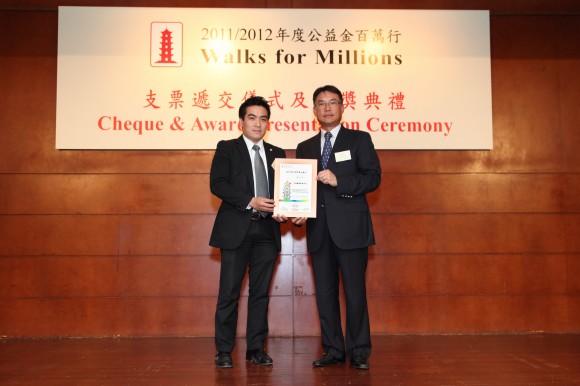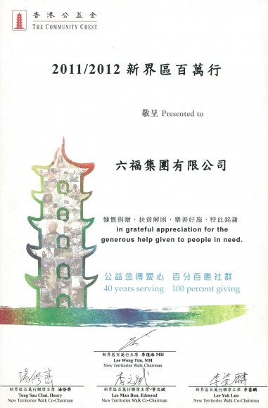香港公益金於2012年5月29日在香港會議展覽中心舉行「2011/2012年度公益金百萬行」支票遞交儀式,由六福集團執行董事黃浩龍先生代表集團將支票轉交予新界區百萬行主席團主席李煌添先生MH及領取證書。