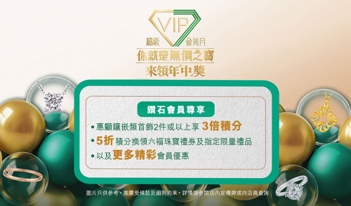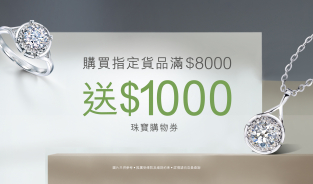 由即日起至2026年1月4日,於港澳指定店舖可享: 購買指定貨品滿$8,000送$1,000珠寶購物券 指定定價黃金首飾低至6.5折 指定鑽石首飾低至7.5折 鑽石...