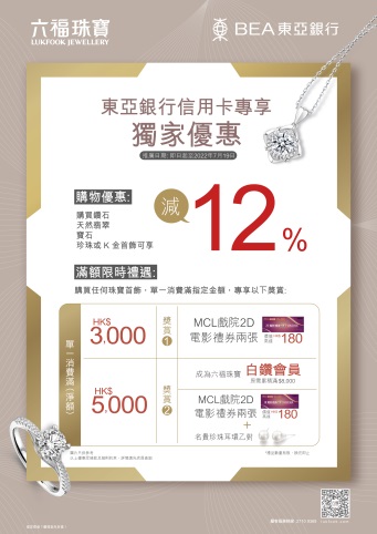 即日起至2022年7月19日,憑東亞銀行信用卡到六福珠寶門店購買鑽石、天然翡翠、寶石、珍珠或K金首飾即可享88折優惠外,任何首飾單一消費滿指定金額更可獲得以下豐富獎賞: