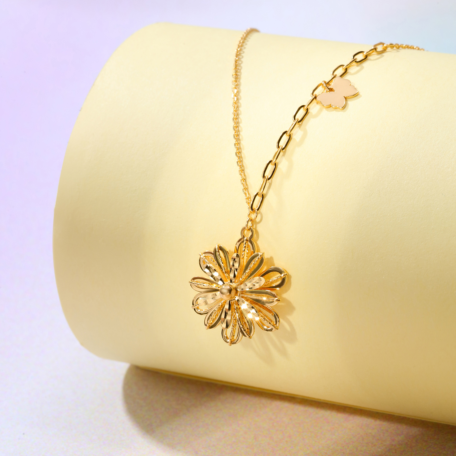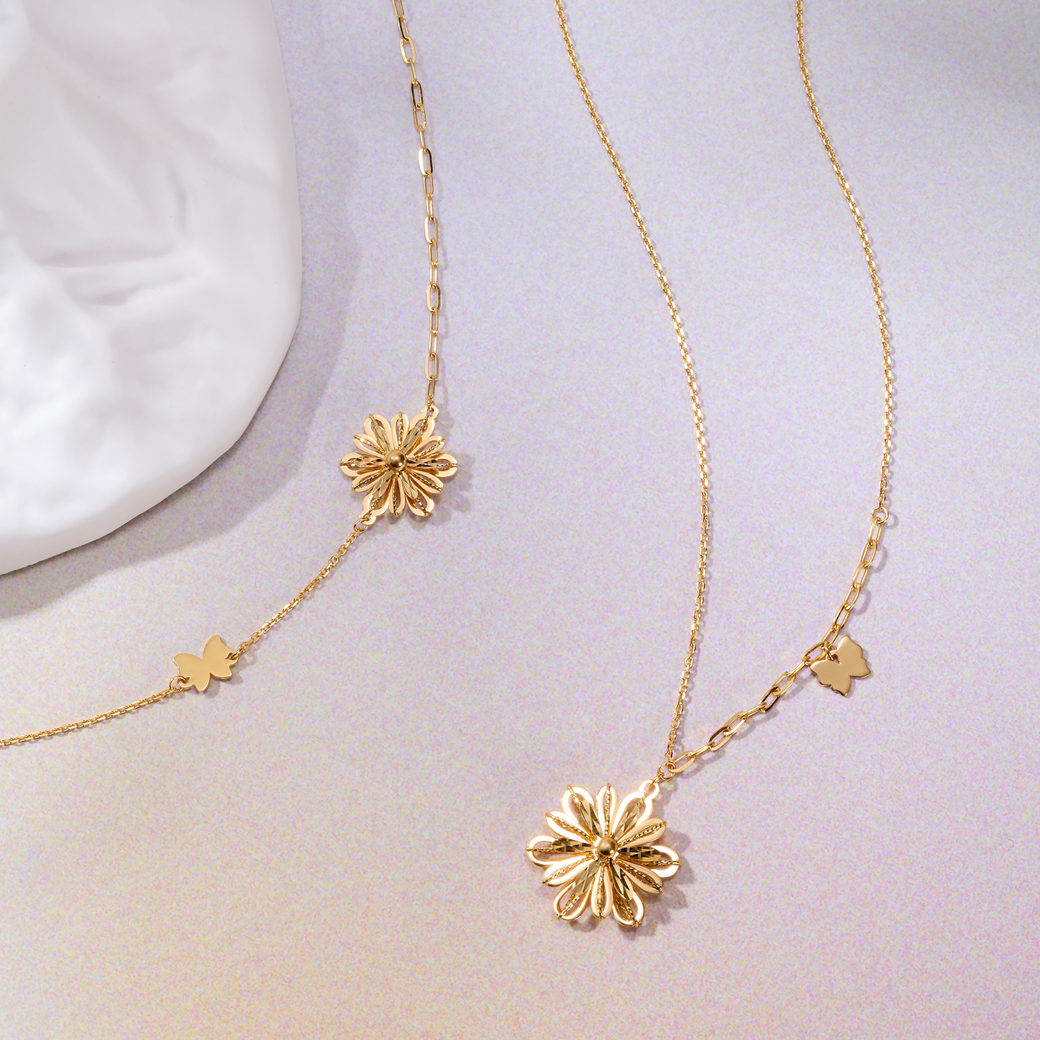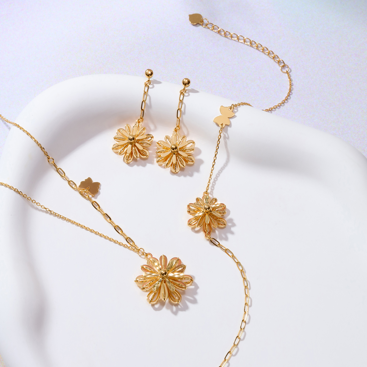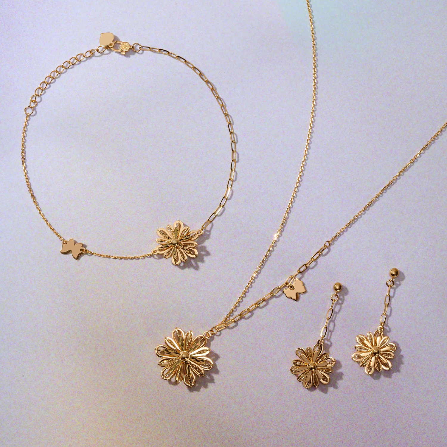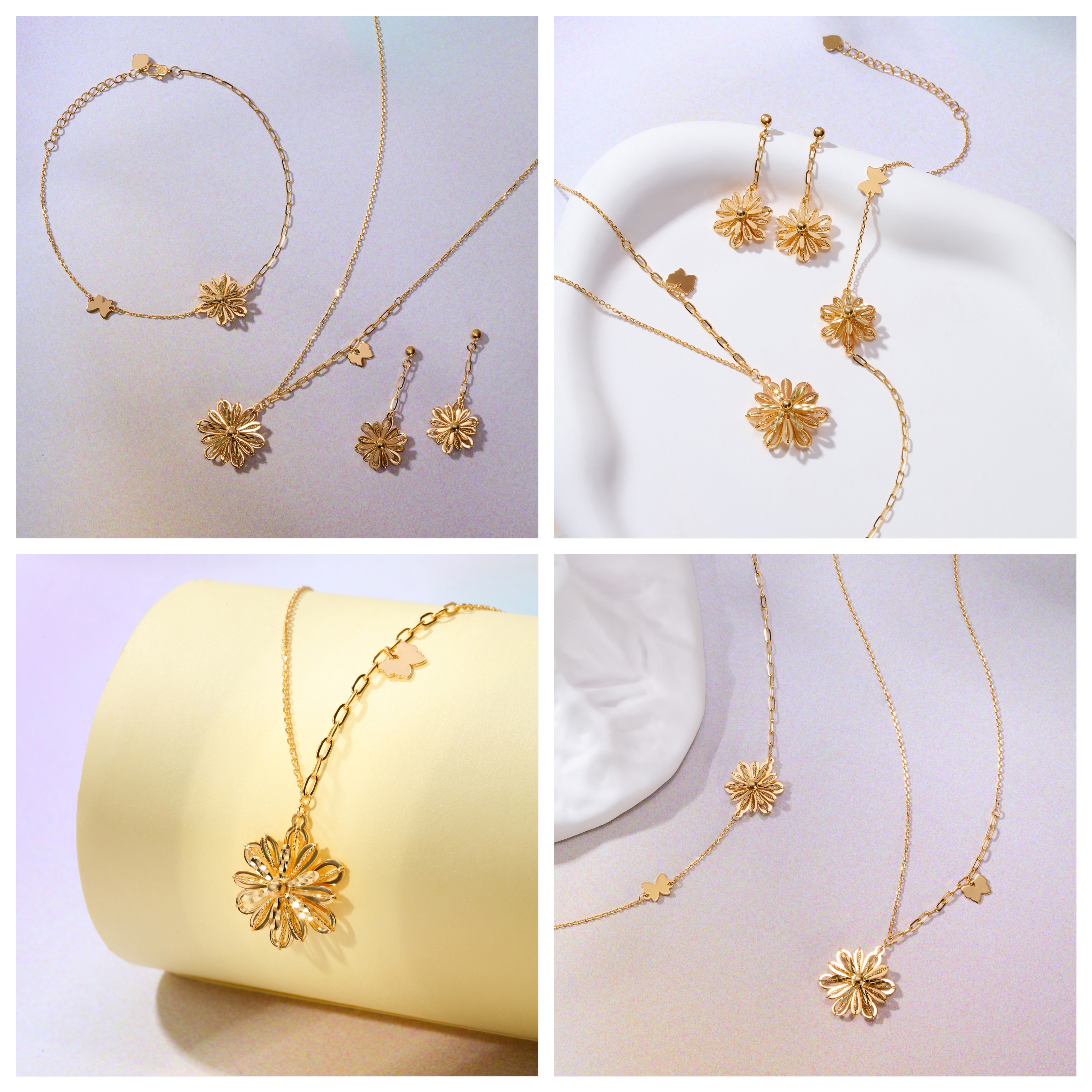 你若盛開,蝴蝶自來。全新Goldstyle「戀花」金飾套裝,以精湛的工藝勾勒出層疊綻放的花瓣造型,將花朵刻畫得栩栩如生。這套金飾由項鏈、手鏈及耳環組成,同造型的項鏈和手鏈均採用不對稱鏈條設計,更於鏈身點綴一只靈動的小蝴蝶,讓甜蜜的氣氛圍繞在身邊,時刻洋溢著活潑、青春的少女氣息。