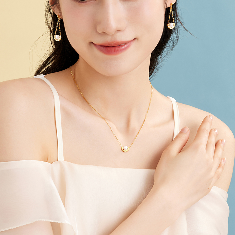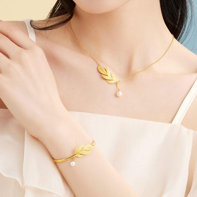 「耀目套裝」以自然之美傾注靈感,將一圈金葉環繞珍珠,綴以多顆閃鑽,釋放清新雅緻的魅力;「霓彩」套裝則以珍珠搭配幾何線條,煥發霓彩四溢的潮流感,在5G精雕鏤空工藝的加持下,更添精緻;至於「一片珍心」套裝,以清新葉片為設計元素,加持黃金噴砂工藝,呈現更加閃亮的視覺效果;不得不提「珍愛時空」吊墜單品,變幻有致的線條紋理宛如時空旋渦,與瑩潤珍珠相互輝映,點綴Love字樣,實在唯美浪漫。