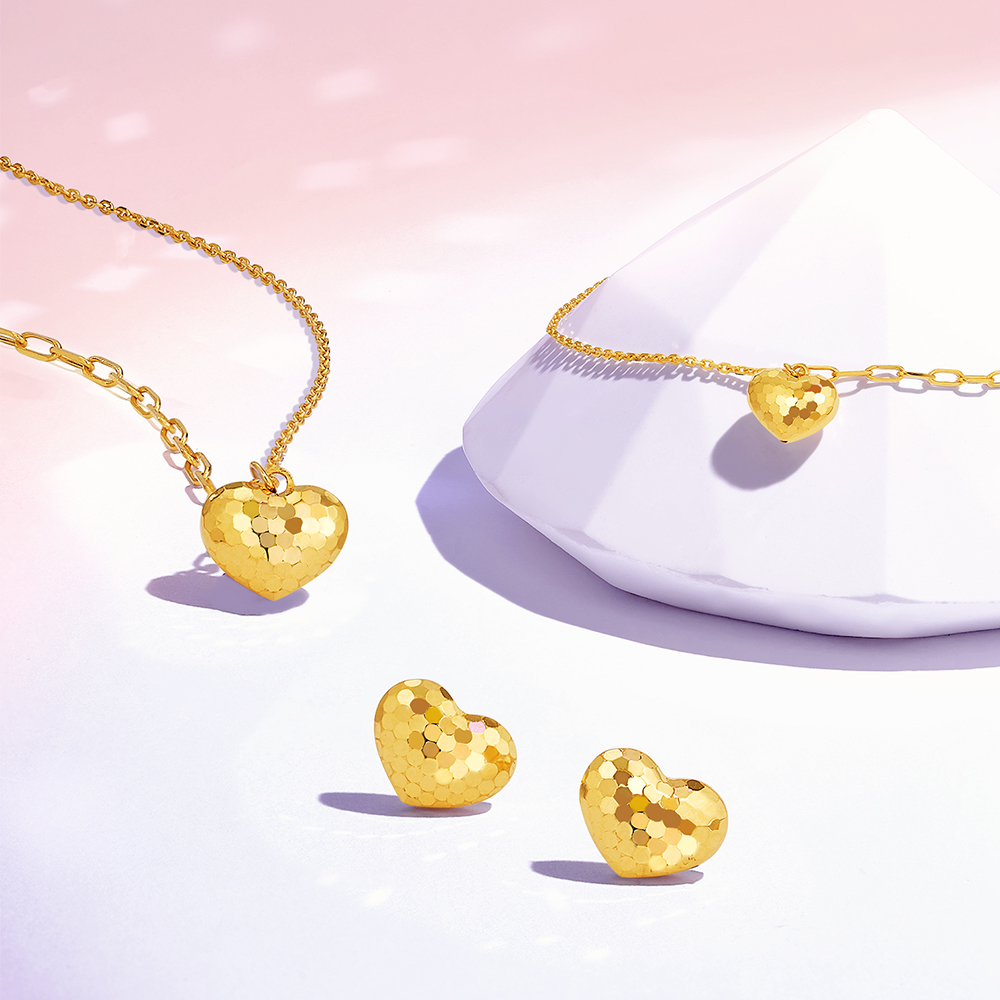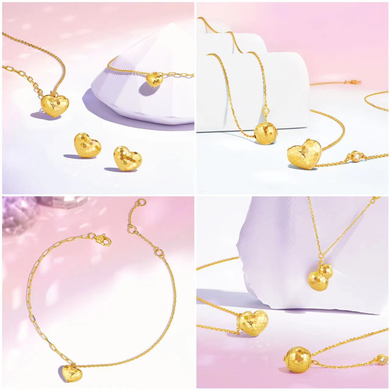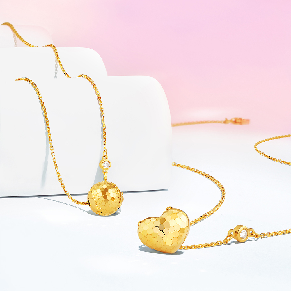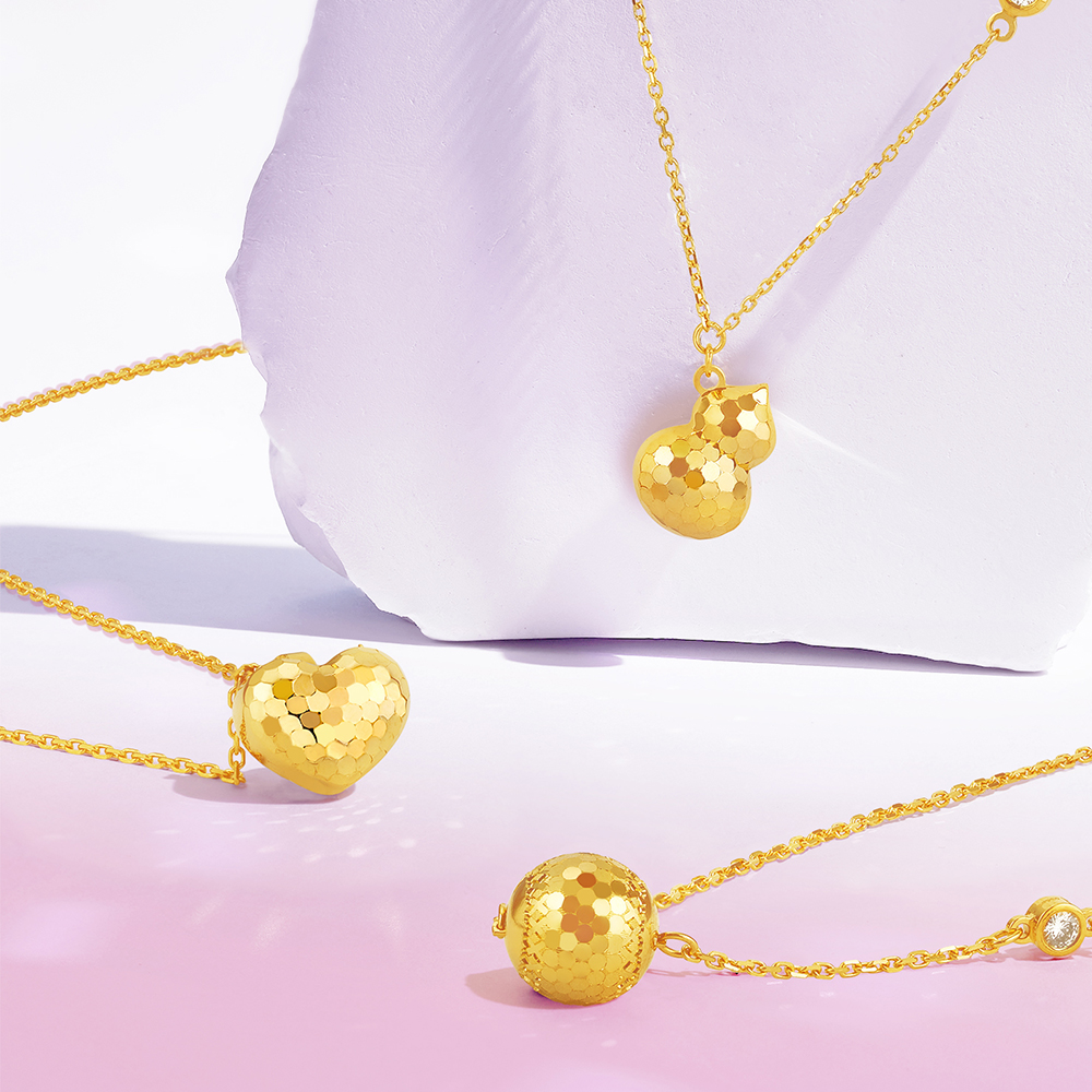 新品以「閃愛悅動」、「閃耀葫蘆」、「閃動星球」為主題,款款時尚炫閃,耀眼吸睛。「閃愛悅動」金飾套裝,以甜美心形為設計造型,寓意怦然心動,愛意永恆不息,時刻散發愛的光芒;而「閃耀葫蘆」金飾套裝將傳統吉祥元素與時尚設計巧妙融合,以收納天地福氣的葫蘆為造型,祈願福祿綿延;至於「閃動星球」金飾套裝以宇宙星辰為設計靈感,利用精湛工藝呈現鏡球效果,在光影變幻中釋放盈動閃耀的時尚之美。部分款式更有鑲鑽款以供選擇,黃金的華麗加持鑽石的璀璨,為你點亮每一個高光時刻。