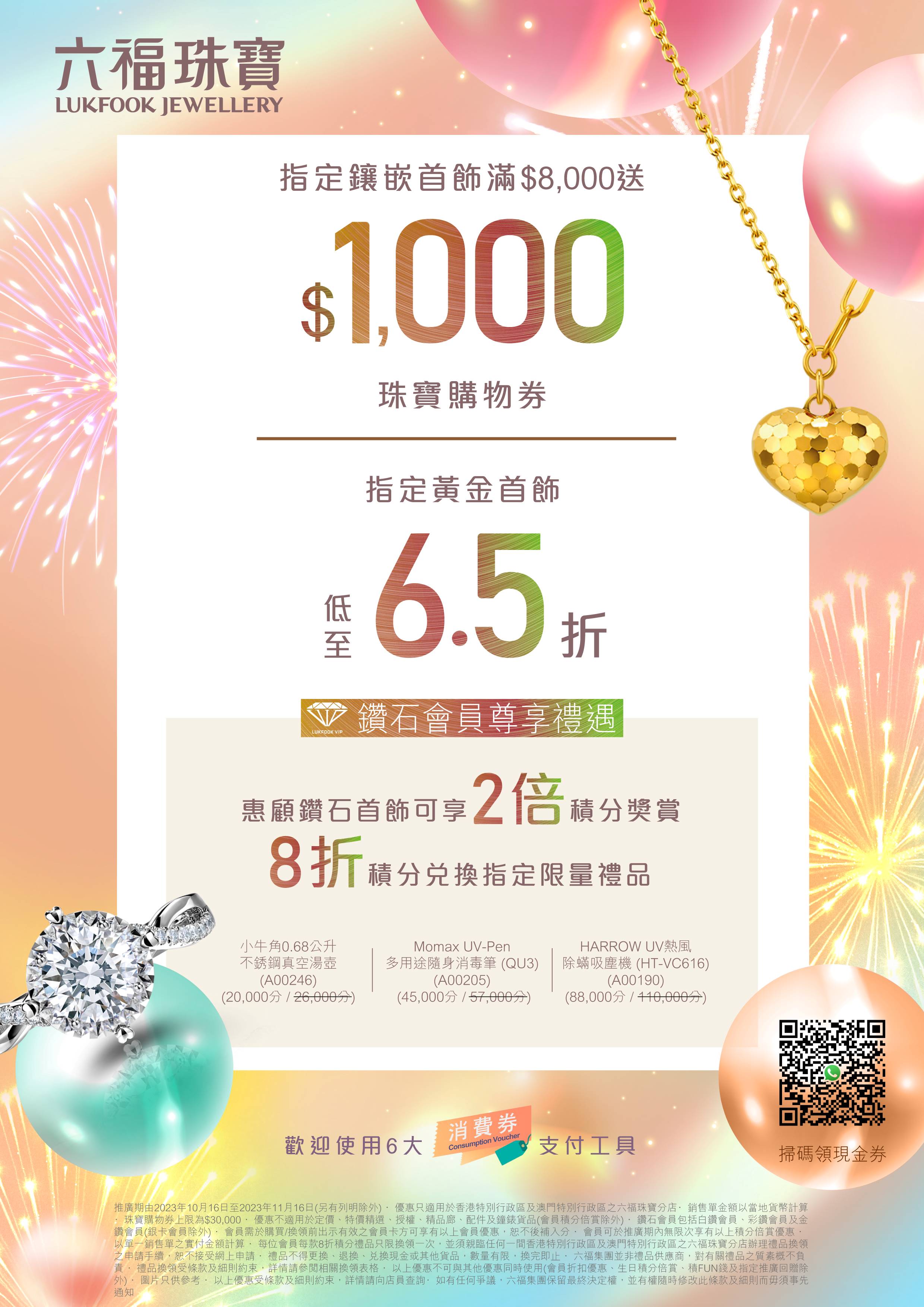 六福珠寶呈獻限時驚喜購物優惠,即日起至2023年11月16日,於港澳指定分店可享: