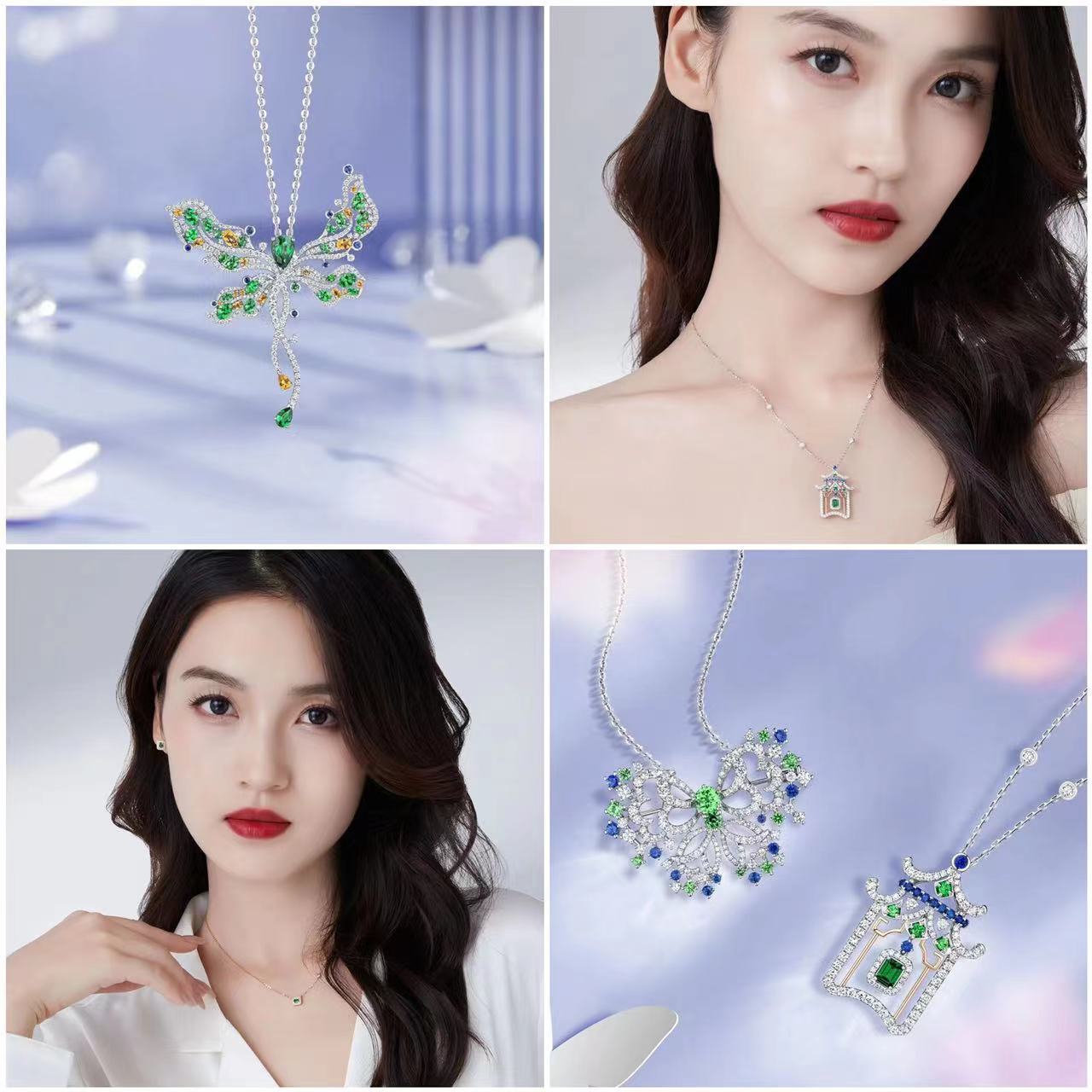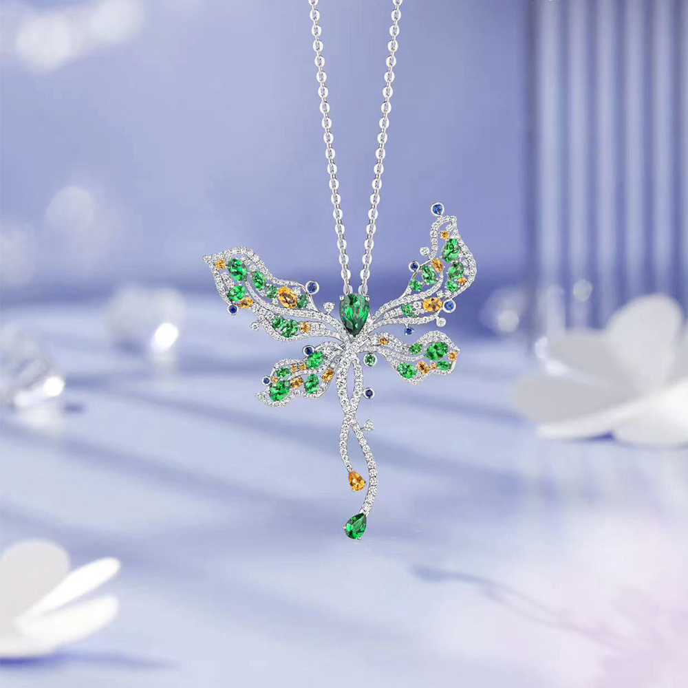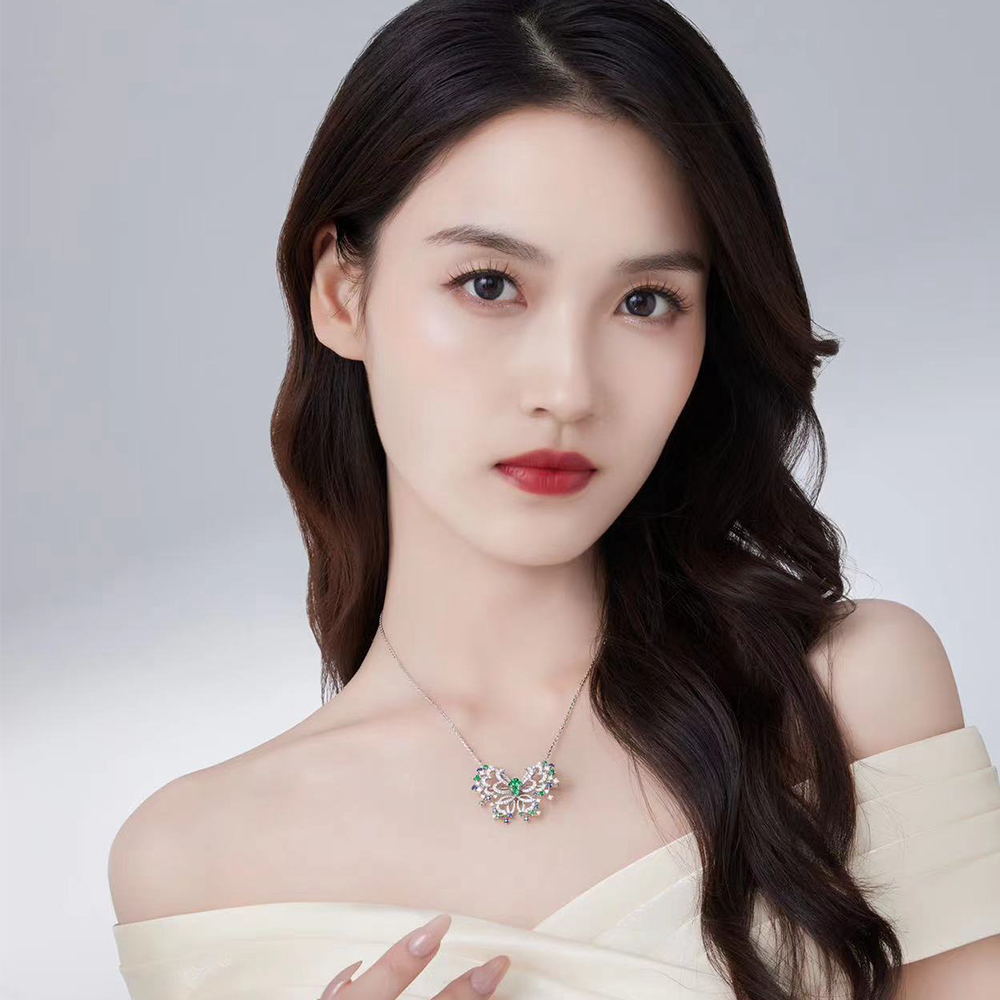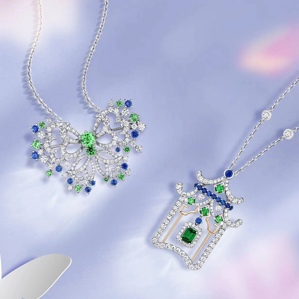 「蝶姿舞彩」將鏤空設計的蝴蝶造型唯美呈現,翩然舞姿靈動閃耀,點亮日常穿搭;以滿鑽線條勾勒出亭閣造型的「春色滿園」,將古韻雅致的東方園林文化意趣融入設計中,復古華麗;至於「春日影跡」,以曼妙舞動的蜻蜓元素設計,可作為吊墜及胸針兩種戴法,賦予更多穿搭靈感。