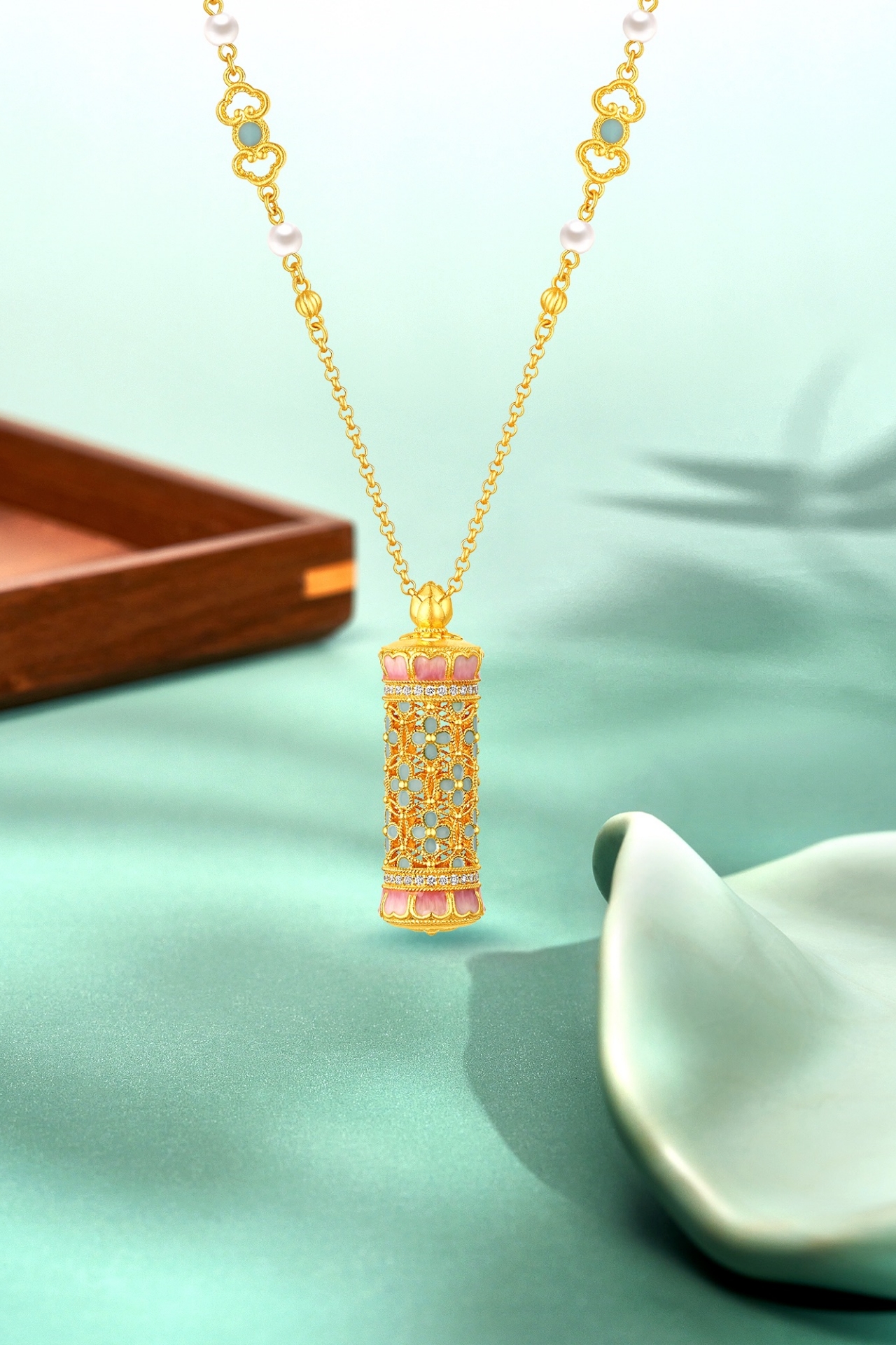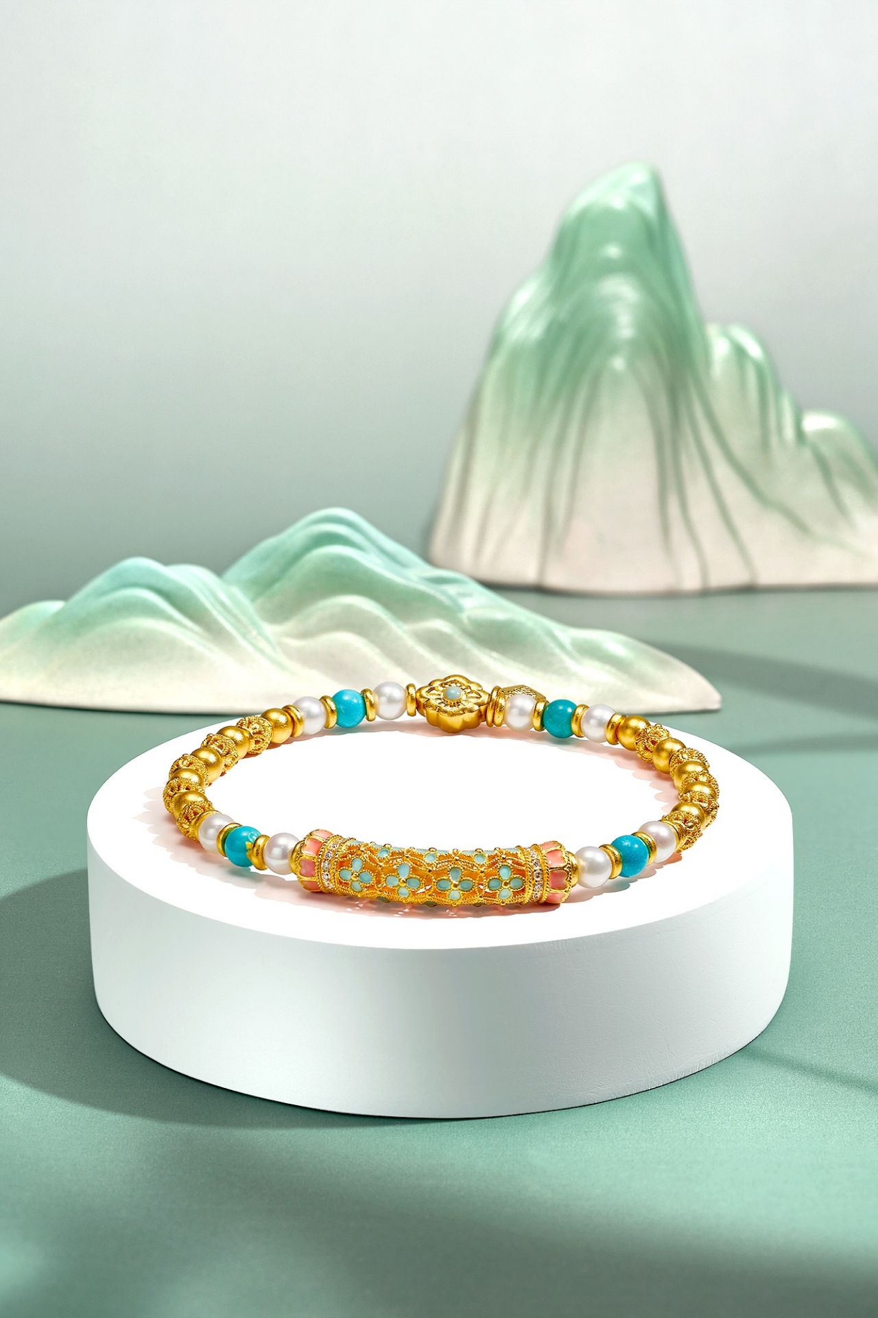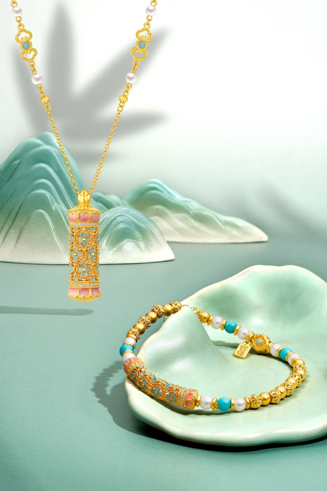 全新「宋韻傳家-花開海韻」黃金鑽石套裝,設計靈感源自宋錦紋樣,以鏤空花絲工藝鑲嵌鑽石,綴以天青色和藕粉色鎏彩,將花意嫣然的美景凝於頸間腕上,彷彿置身輕鬆自然的風雅盛事。手鏈款有多種圈數可供選擇,多圈款手鏈還可作頸鏈一款多戴;綠松石與珍珠的巧妙相襯,色彩和諧,傳頌和美與幸福的美好寓意。