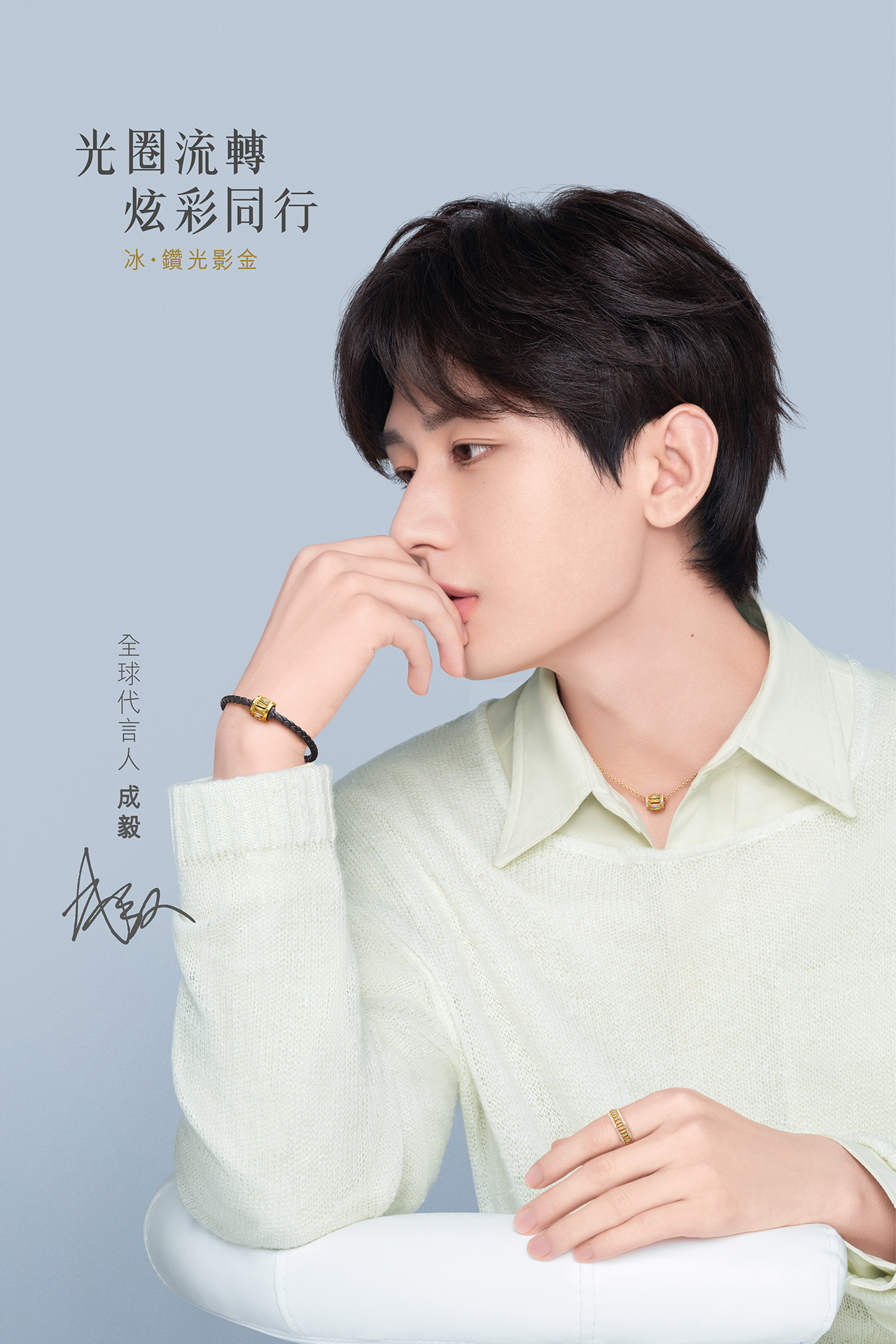 六福珠寶全球代言人、實力演員成毅十餘年專注演藝事業的赤誠之心,與六福珠寶專注於黃金工藝的匠心精神不謀而合。「冰‧ 鑽光影金」利用CNC工藝複刻花絲,以黃金硬度突破傳統局限,正如成毅在角色中不斷突破自己,和六福珠寶一起並肩同行,攜手譜寫璀璨華章。