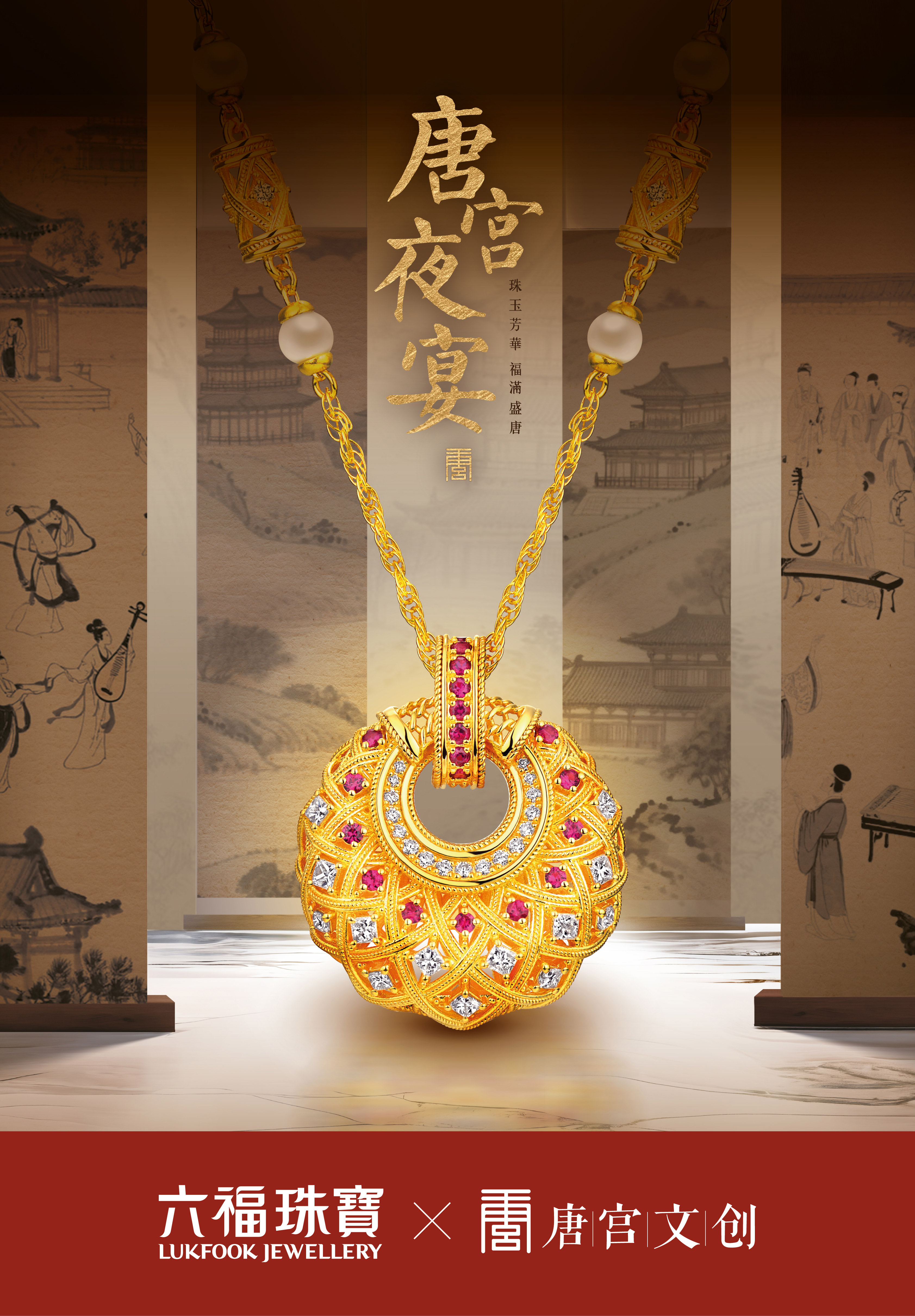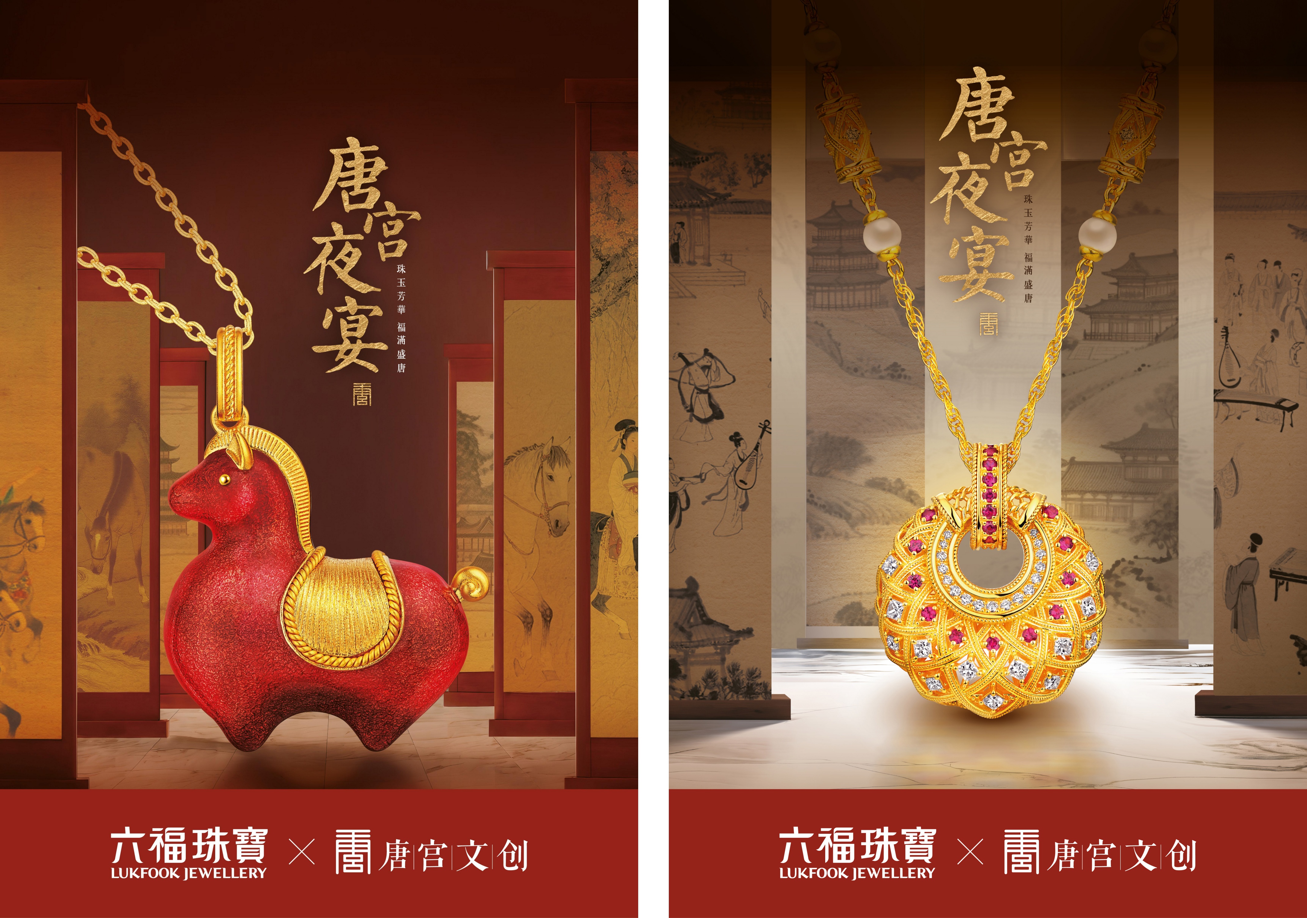六福珠寶攜手唐宮文創旗下的《唐宮夜宴》,以珠寶為媒、文化為魂,打造出兼具文化底蘊與藝術張力的聯名系列,共同詮釋盛唐美學的當代生命力。