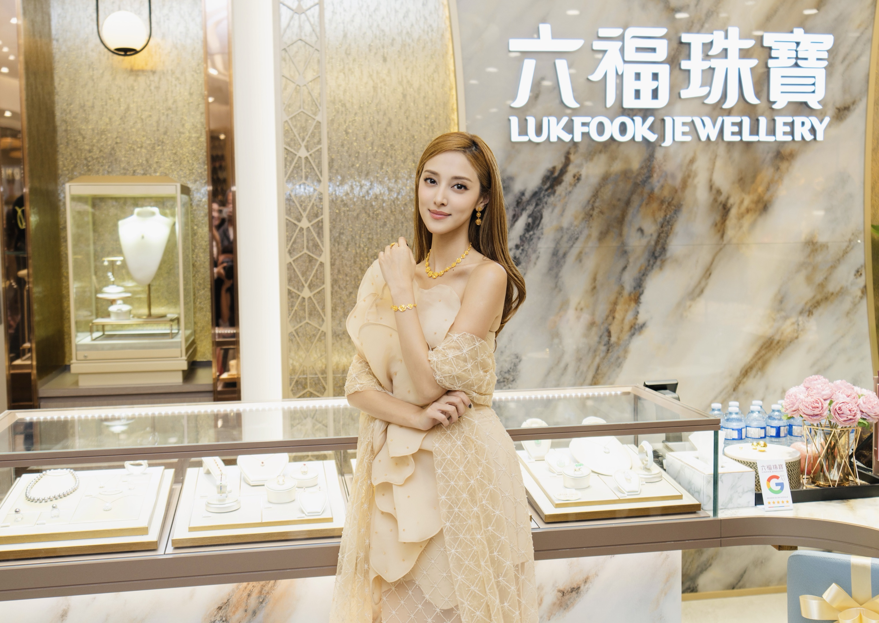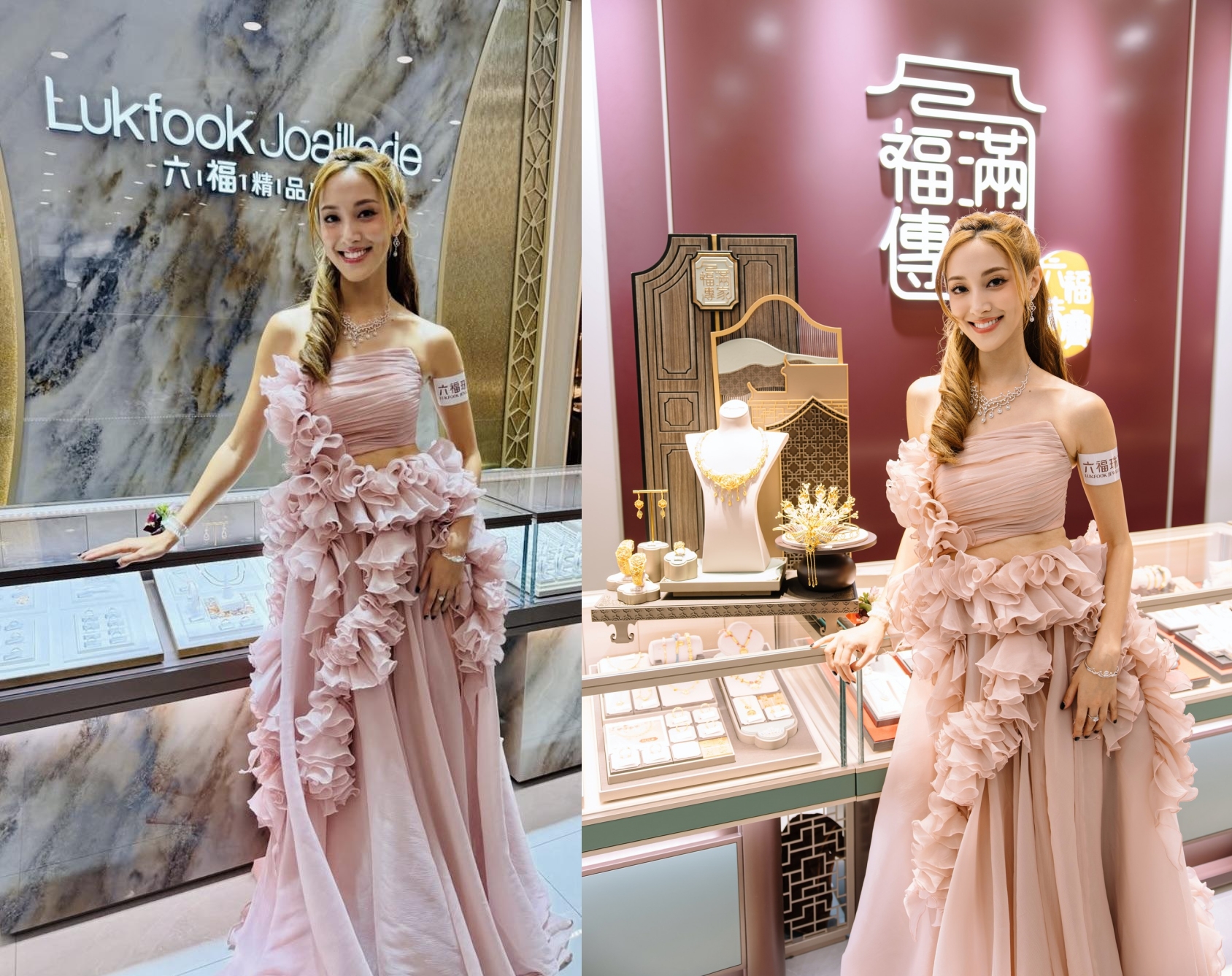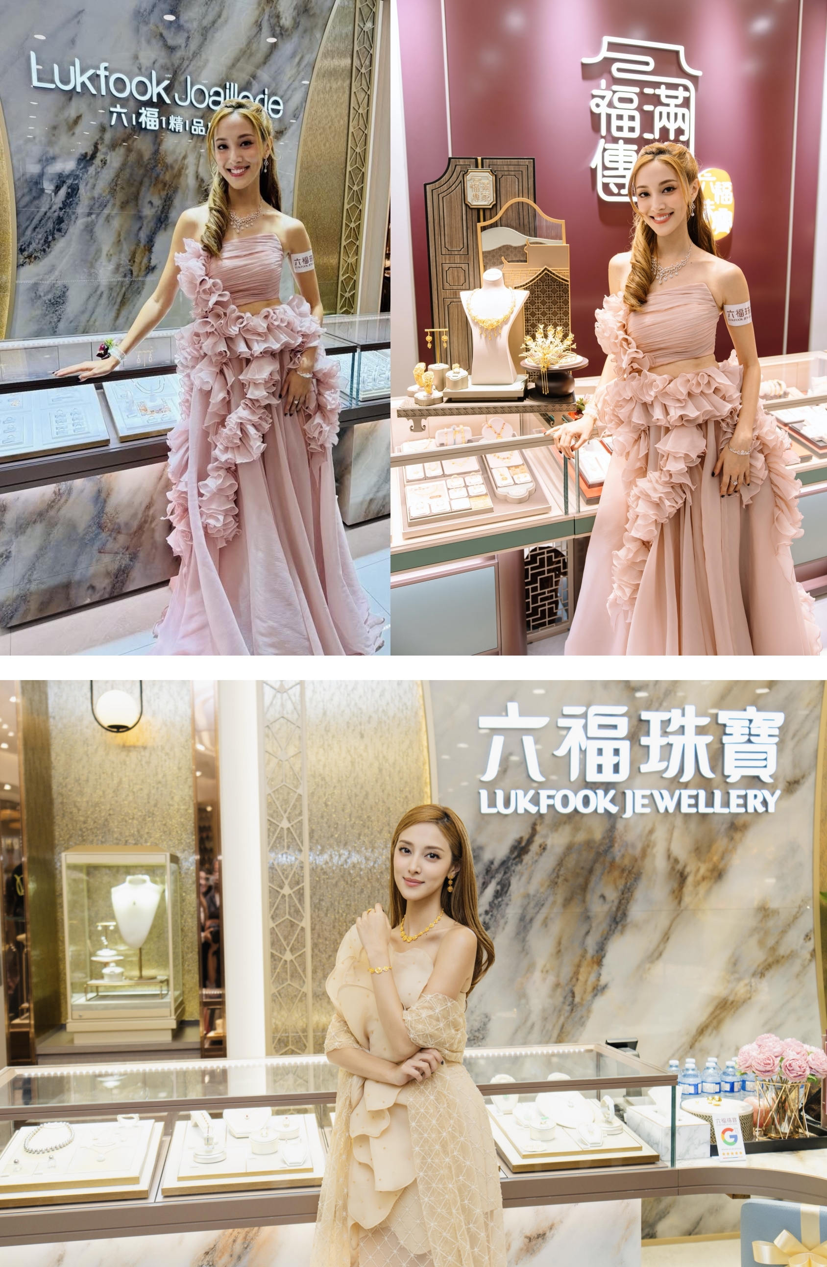 陳凱琳身穿高雅禮服,兩天活動分別佩戴上六福珠寶婚嫁系列18K金鑽石首飾及「冰‧鑽光影金」黃金首飾,在熠閃珠寶映襯下格外明豔照人。