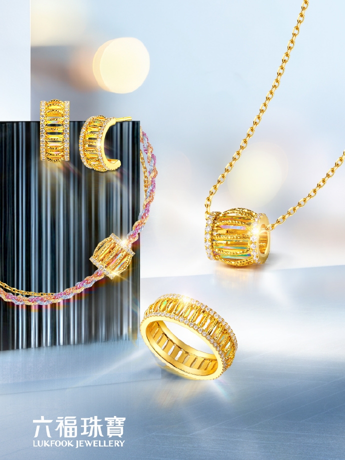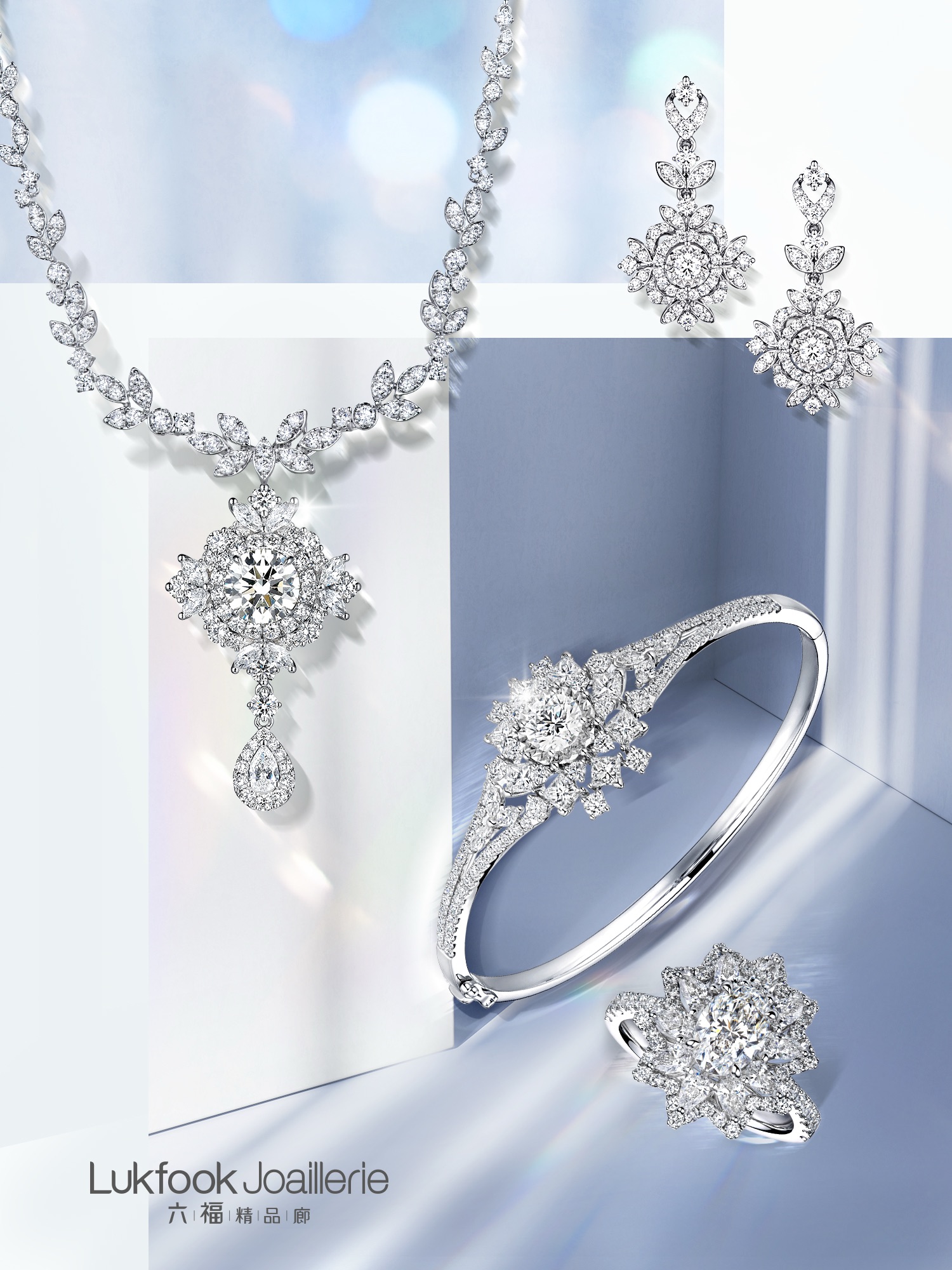 「冰‧鑽光圈」黃金鑽石首飾,以炫彩金片構築俐落的條紋造型,巧妙融合立體車花線,宛如鐫刻愛的軌跡,雙側點綴天然鑽石,在光影流轉間熠閃心動光芒,串飾更可一款兩戴,頸鏈或手繩隨心切換,輕鬆解鎖穿搭新靈感。而瑰麗大氣的六福精品廊鑽石首飾套裝,巧妙融合不同切割形態的天然鑽石,勾勒出繁花盛放的靈動姿態,中央主鑽如眾星拱月,在層疊交織的花瓣環繞中凝聚璀璨光芒,定格浪漫瞬間。