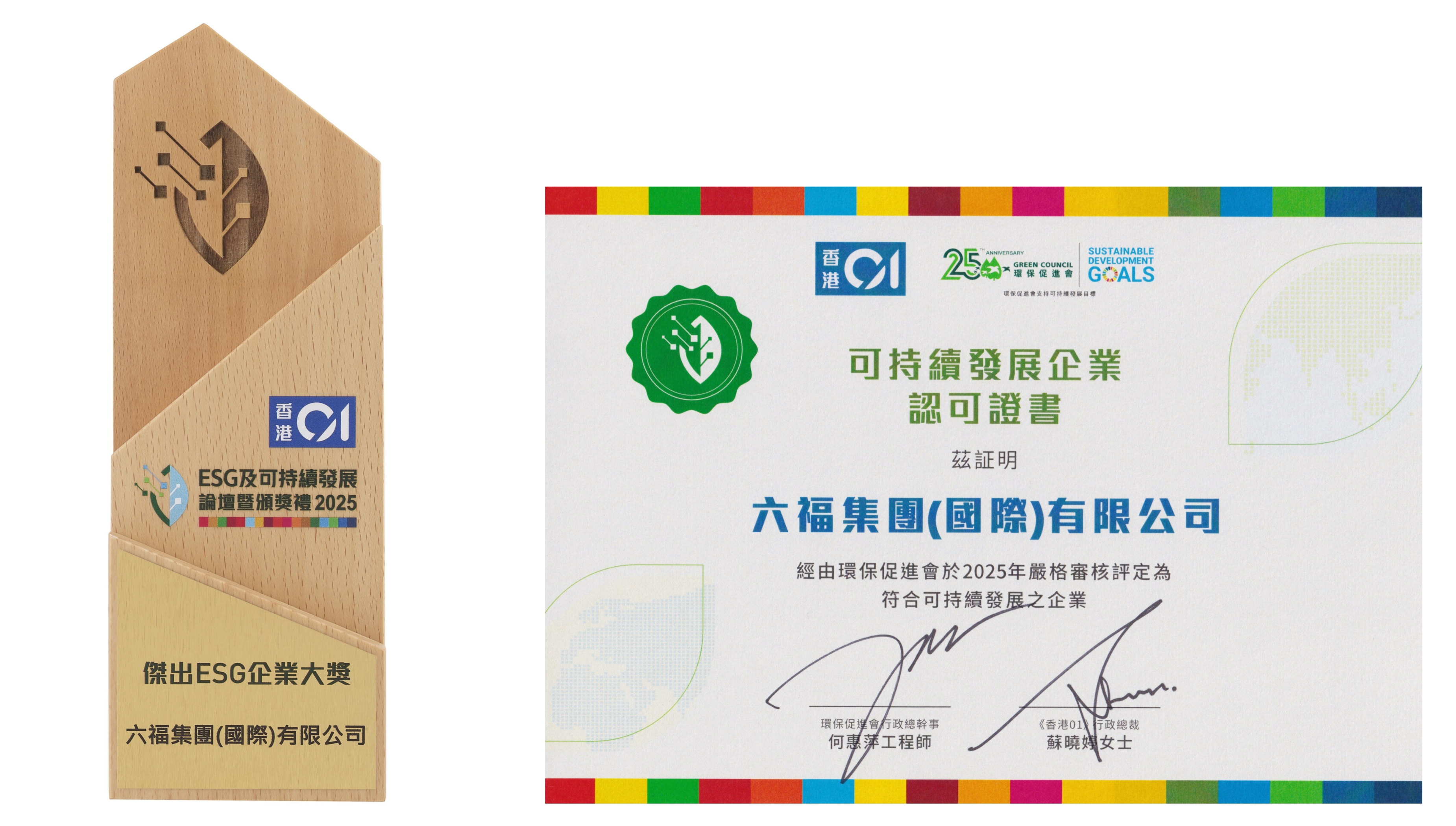 六福集團(國際)有限公司(「六福」/「集團」)(股份代號:0590)欣然宣布,憑藉在環境、社會及管治(ESG)領域的長期承諾與卓越貢獻,榮獲《香港01》及環保促進會頒發「傑出ESG企業大獎」及「可持續發展企業認可證書」,充分肯定集團將可持續發展融入業務經營的成果,並彰顯其推動業界可持續發展的努力。