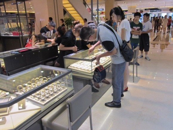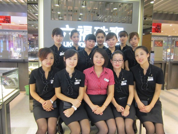 該專櫃貫徹六福珠寶作風穩健、信譽超卓的品牌形象,採用最新一代裝潢風格,整體散發著精緻華美的氣息;巧奪天工的珠寶首飾展示在最新款香檳色調的陳列道具上,更加熠熠生輝,耀眼奪目,吸引了眾多顧客駐足。其中黃金類飾品更是受到了廣大顧客的喜愛,「囍愛」嫁囍系列、金飾魅力系列的道具台前總是擠滿顧客,他們或鍾情於神態活靈活現造型立體的十二生肖吊墜,或試戴著滿載愛意的婚嫁黃金飾品。店內熱情的營業員亦為每一位選購的消費者耐心講解著飾品的含義及黃金貨品的保養守則,使每位顧客都體會到了六福貼心、專業的服務。