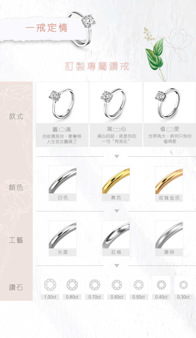 5 個訂製婚戒步驟 六福珠寶堅信,每段愛情故事都有其獨特的意義,因此將此意義化作設計靈感,透過一對一專業跟進服務及「5」個訂製步驟,包括挑選專屬結婚戒指款式、精準測量手寸、確認效果圖、免費刻字服務及輕鬆取貨,為婚戒增添一份儀式感。
