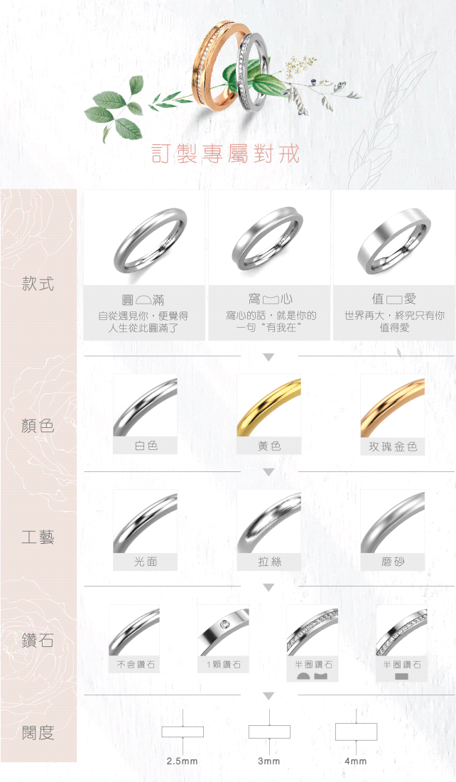 準新人必讀!教你5個訂製婚戒步驟結婚是人生大事,揭開人生新的一頁,因此準備婚戒更是意義重大。婚戒象徵著承諾,承載著你倆獨一無二的愛情,把這份如斯神聖的愛情牢牢套在無名指上,是一生只愛一人的信仰。婚姻既是神聖的信仰,一生一次,因此挑選結婚戒指絕不能馬虎。可是,並不是每對新人都懂得挑選婚戒,因此各位新人如何挑選或訂製別具意義的婚戒也是一門重要的學問。 |