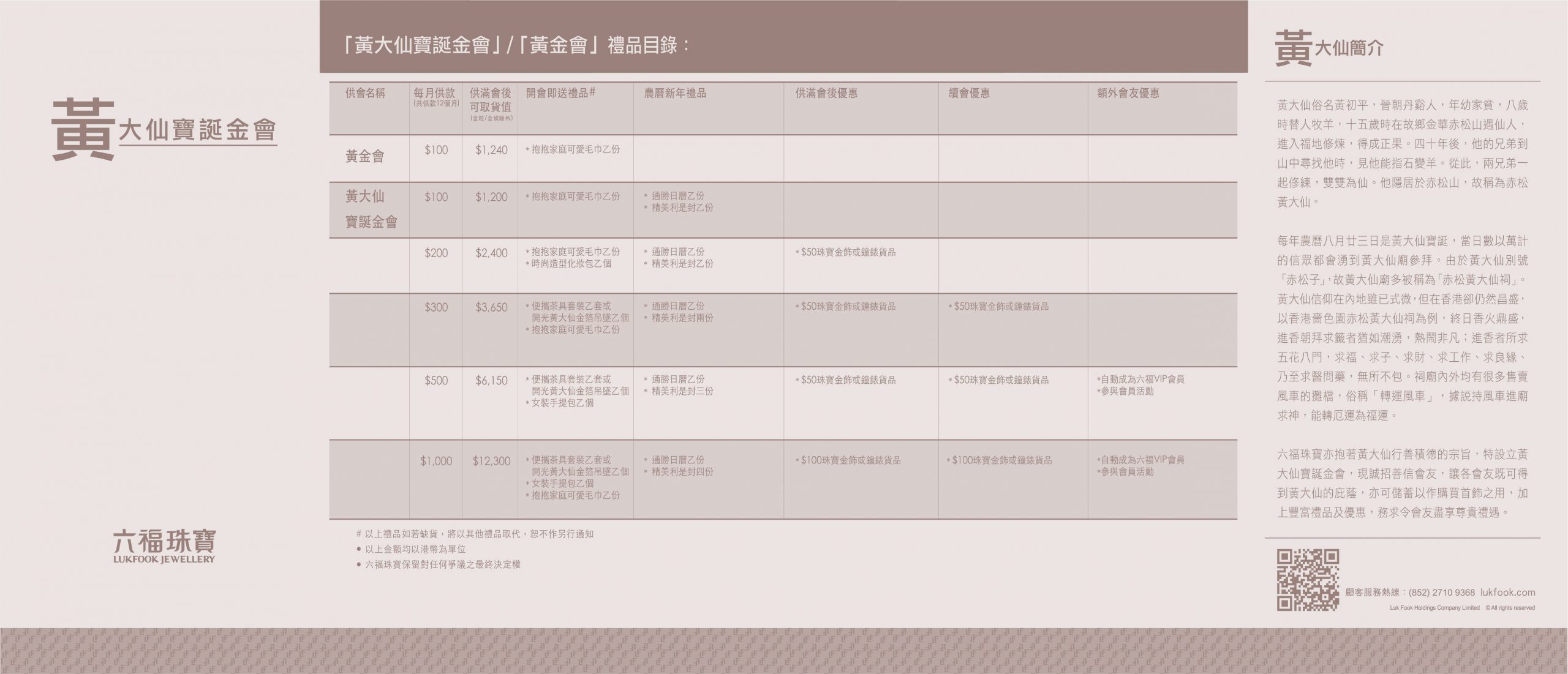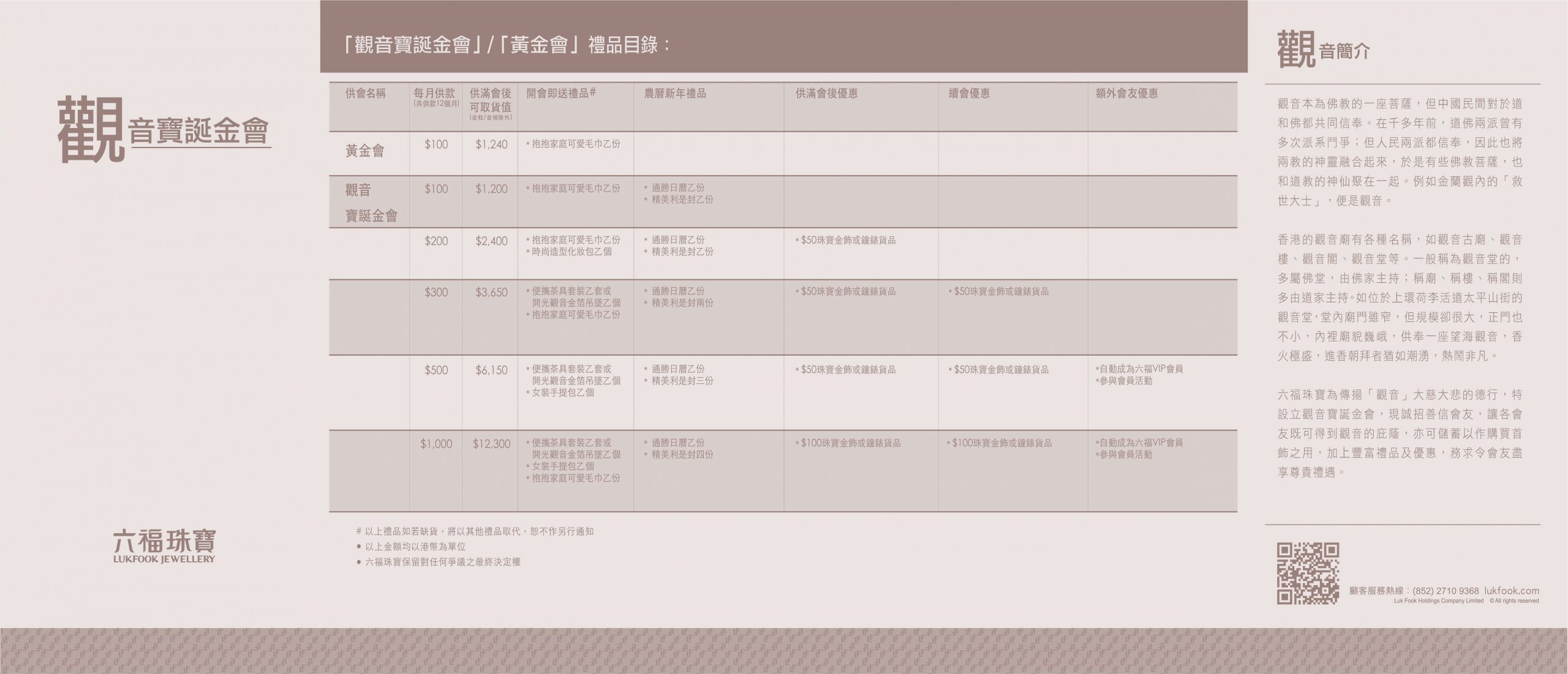 六福珠寶為傳揚慈悲為懷和行善積德的精神,特設立黃金會、觀音寶誕金會以及黃大仙寶誕金會,現誠招善信會友,讓各會友既可得到神明的庇蔭,亦可儲蓄以作購買首飾之用,加上豐富禮品及優惠,務求令會友盡享尊貴禮遇。(只適用於香港特別行政區分店) 觀音寶誕金會黃大仙寶誕金會
