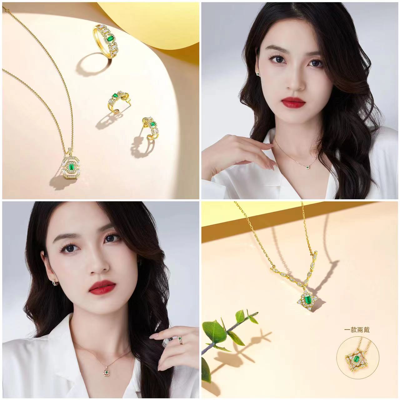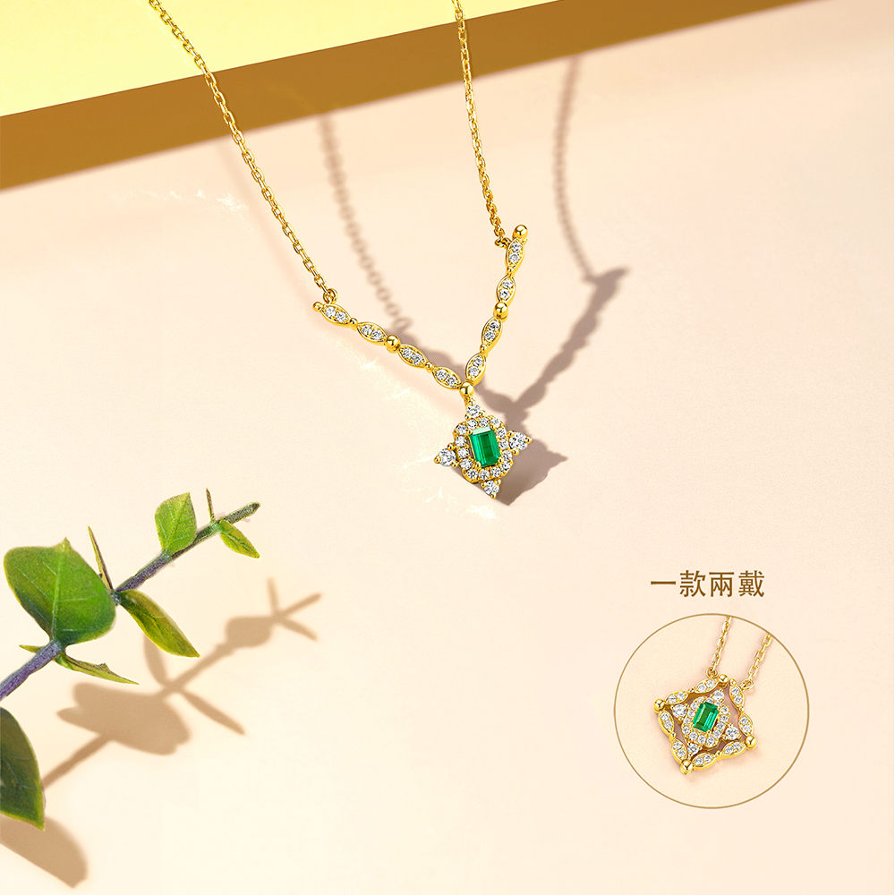點綴一抹綠意,凝聚璀璨繽紛。全新「凝彩美寶」18K金鑲鑽寶石首飾,以多顆閃鑽鑲嵌設計組合而成,復古優雅的綠寶石與亮麗18K金巧妙融合,打造出多款獨特又亮眼的時尚鑽飾。