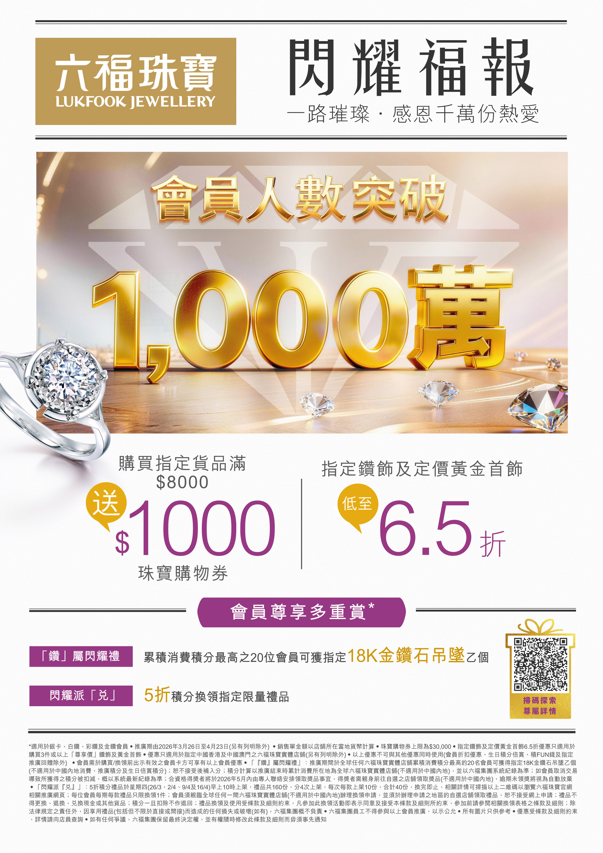 即日起至2026年4月23日,於中國香港及中國澳門指定六福珠寶店舖: