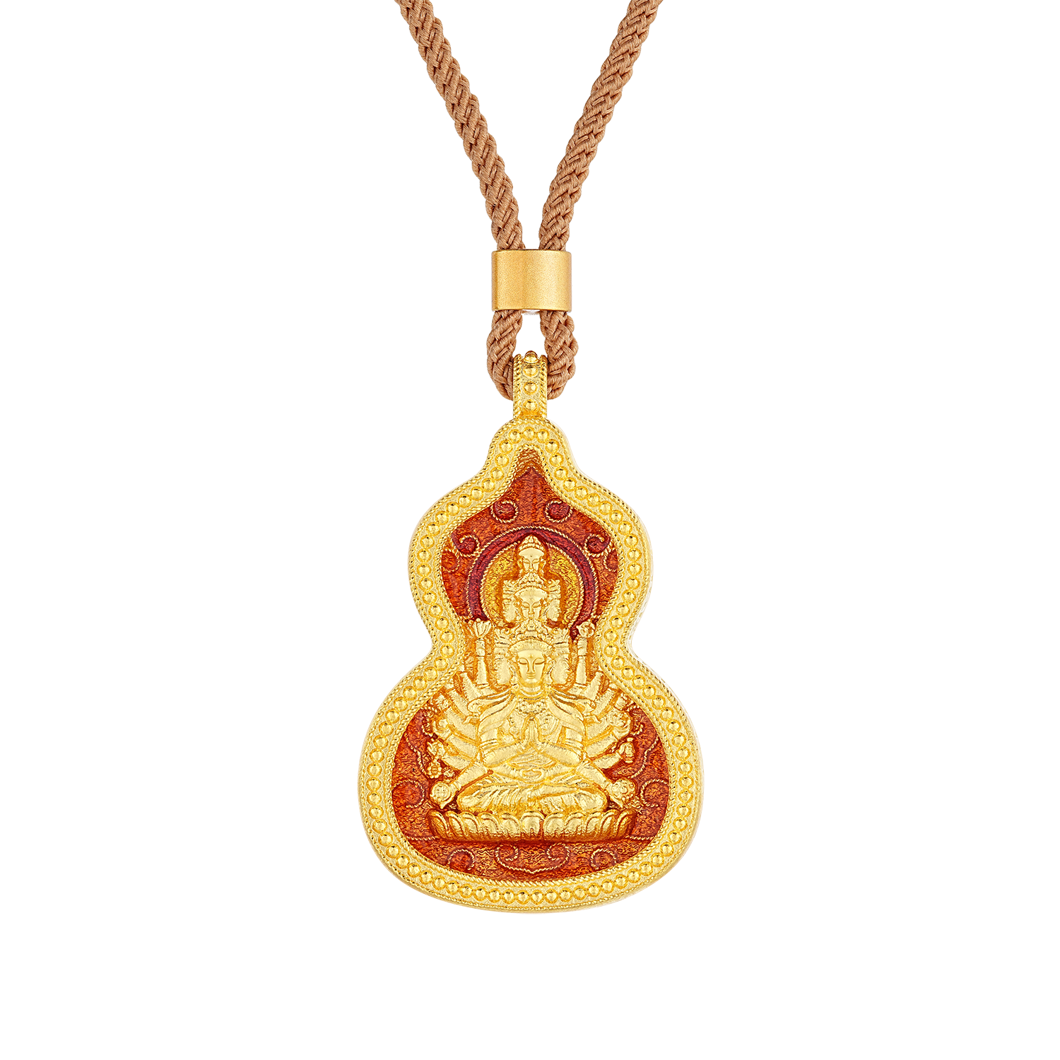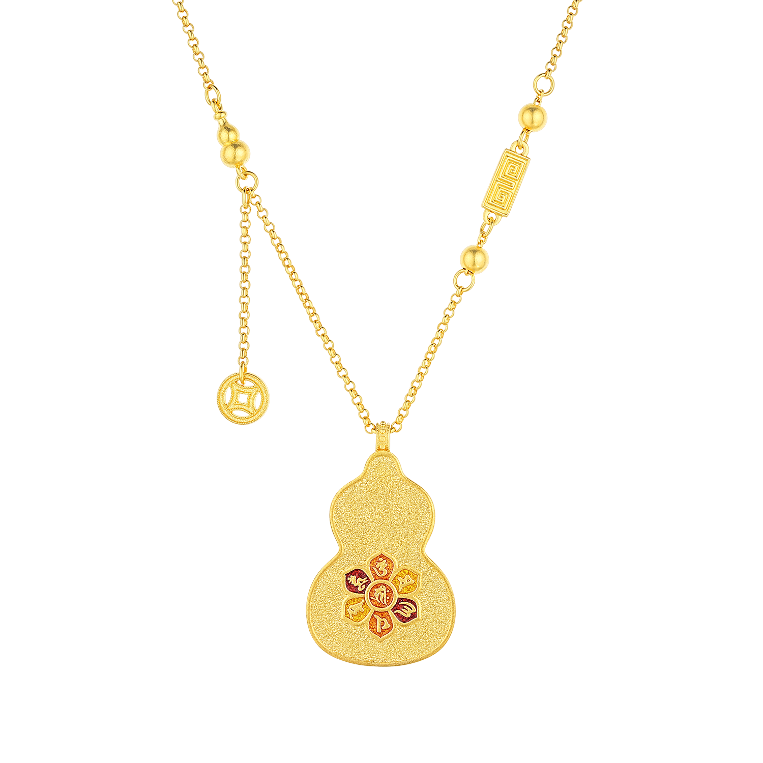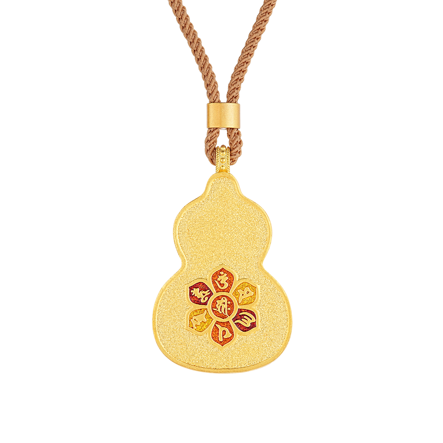 以葫蘆為佛龕,寓意佛佑福祿;背面的“六字箴言”及梵文佛號,蘊含諸佛的加持與慈悲的祝福寄語。加入特製亮片的星空琺瑯工藝,讓飾品熠熠生輝。每款均備有黃金吊墜、黃金項鏈及黃金鑲鑽項鏈版可供選擇。