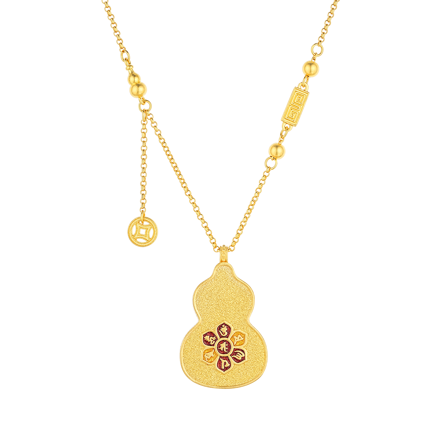 以葫蘆為佛龕,寓意佛佑福祿;背面的“六字箴言”及梵文佛號,蘊含諸佛的加持與慈悲的祝福寄語。加入特製亮片的星空琺瑯工藝,讓飾品熠熠生輝。每款均備有黃金吊墜、黃金項鏈及黃金鑲鑽項鏈版可供選擇。