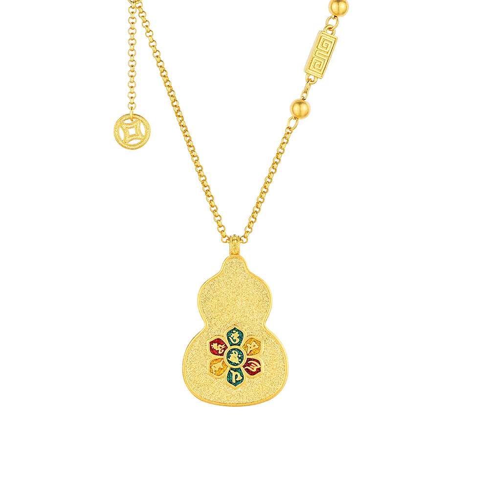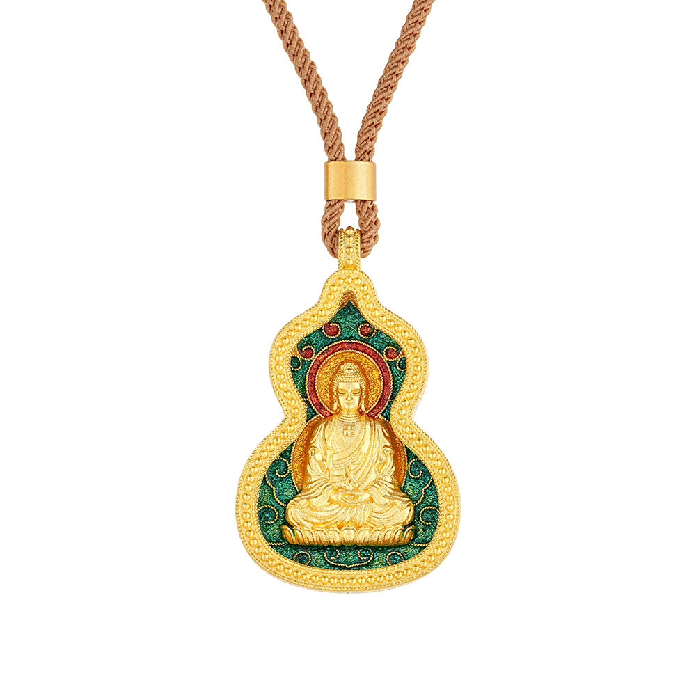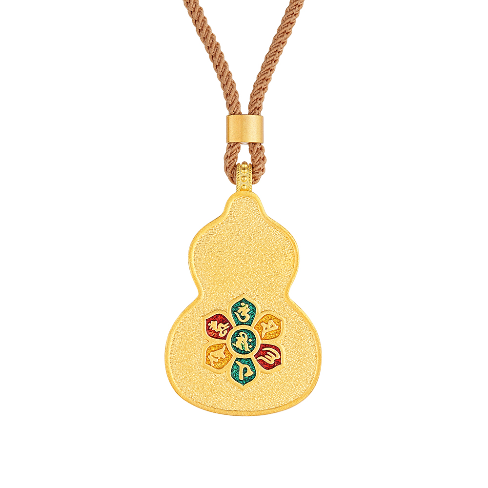 以葫蘆為佛龕,寓意佛佑福祿;背面的“六字箴言”及梵文佛號,蘊含諸佛的加持與慈悲的祝福寄語。加入特製亮片的星空琺瑯工藝,讓飾品熠熠生輝。每款均備有黃金吊墜、黃金項鏈及黃金鑲鑽項鏈版可供選擇。