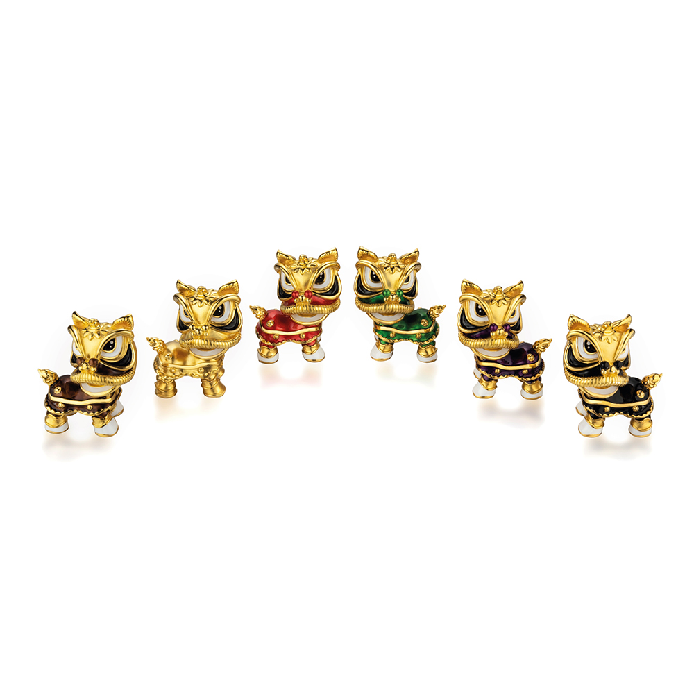 六獅生財實體黃金擺件在傳統雄獅形象基礎上,加入潮流元素,褐、黑、紫、綠、紅、金,分別代表長壽、平安、吉祥、健康、守護、富貴的美好祈願,祈願生活吉祥如意,幸福安康。